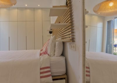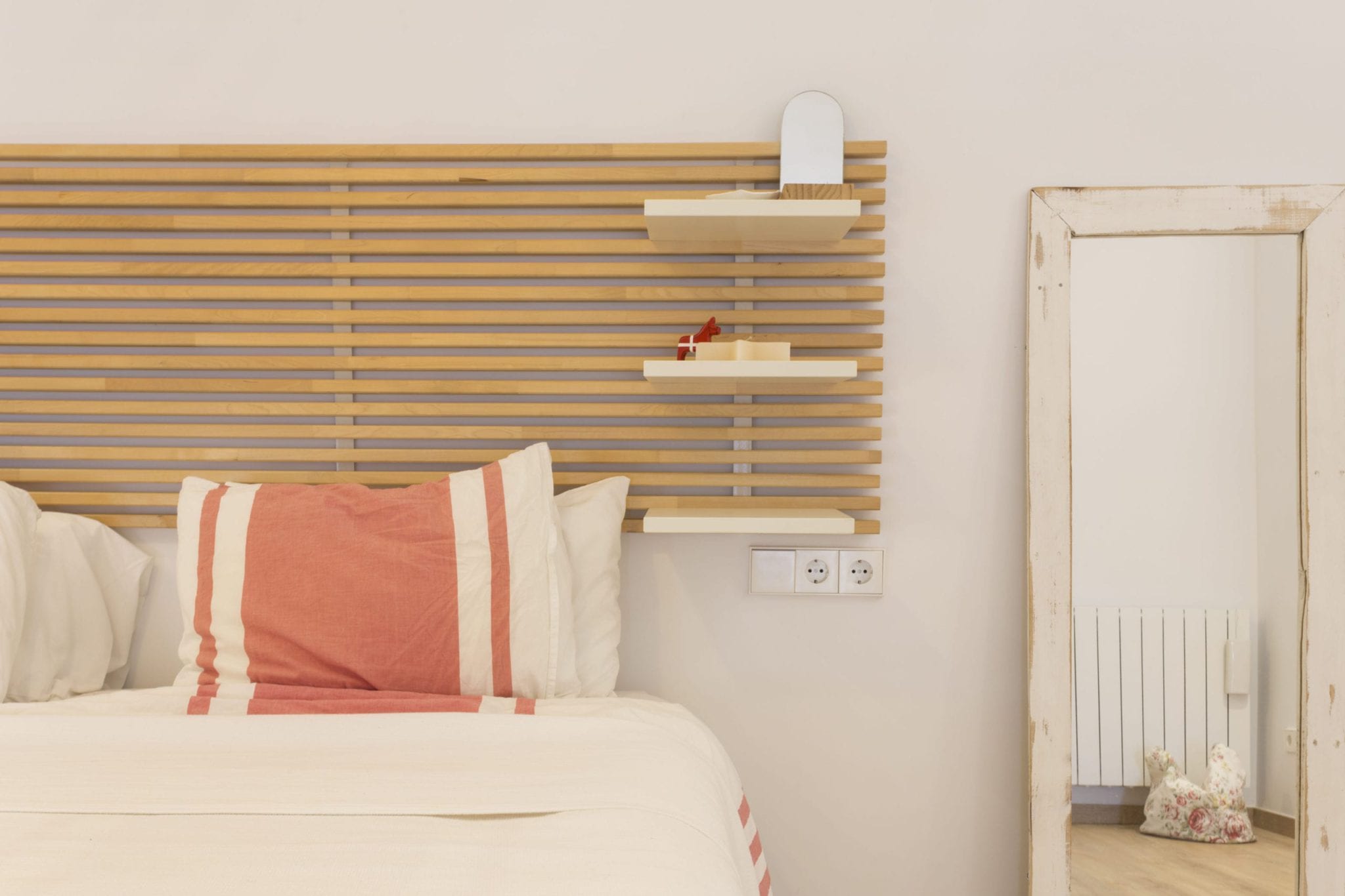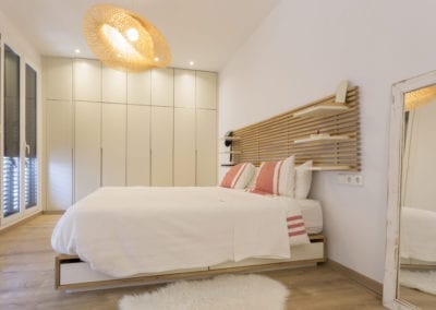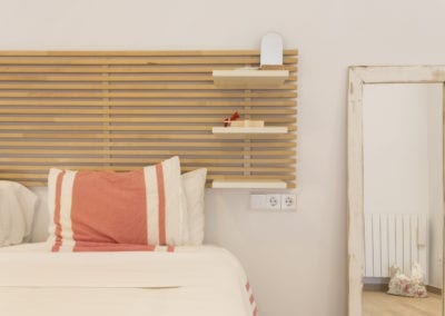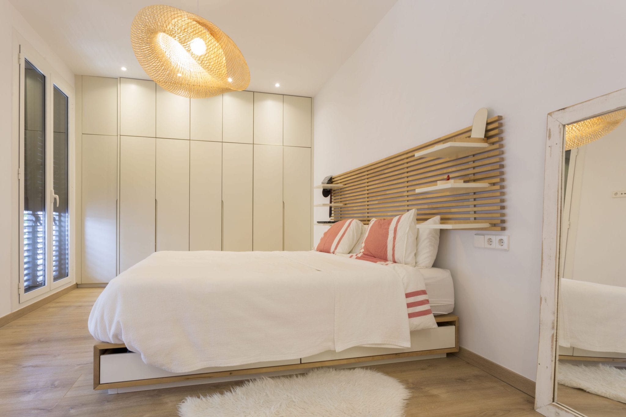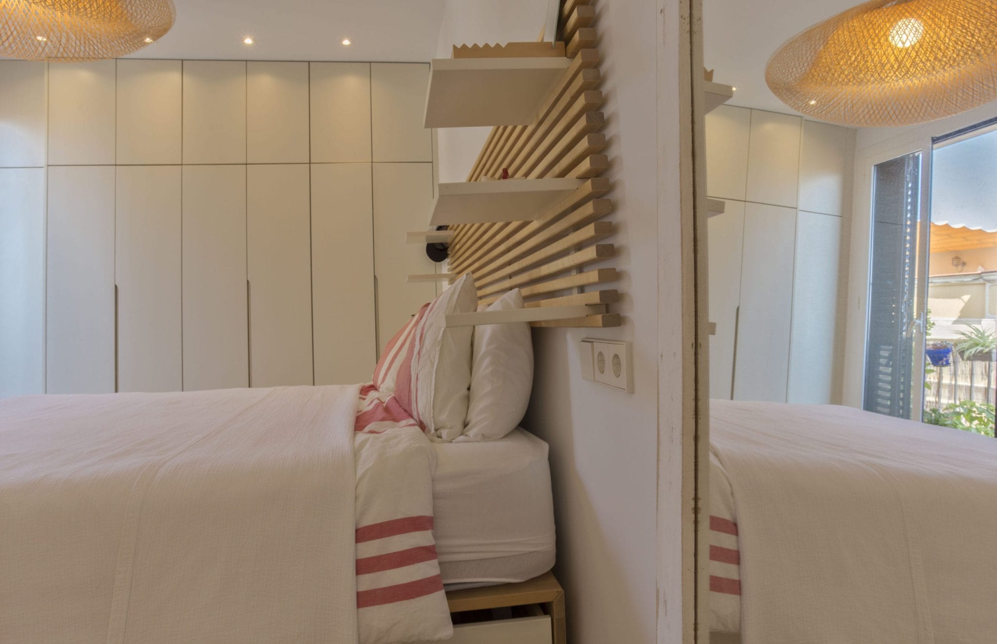En aquesta ocasió, començarem per l’habitació principal, perquè ens encanta com ha quedat amb simples elements i un estil molt subtil. Per les seves tonalitats blanques, el capçal de llistons de fusta amb prestatgeries integrades i la decoració de la lluminària amb fibres naturals de línies corbes, s’aconsegueix una sensació de frescor i aire eco.