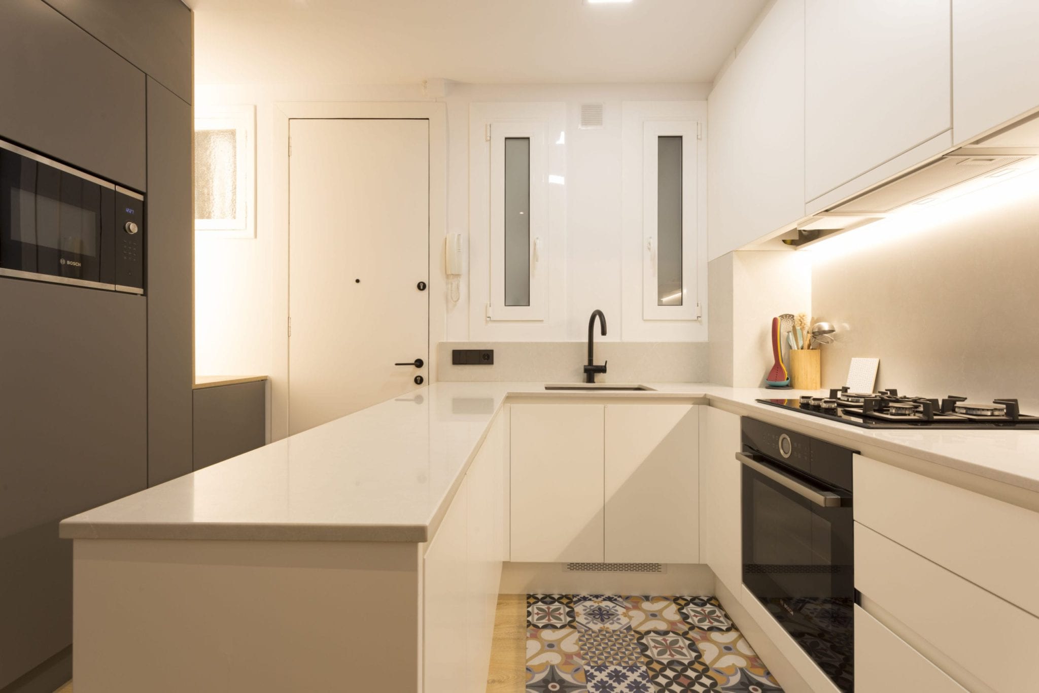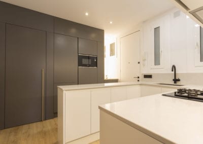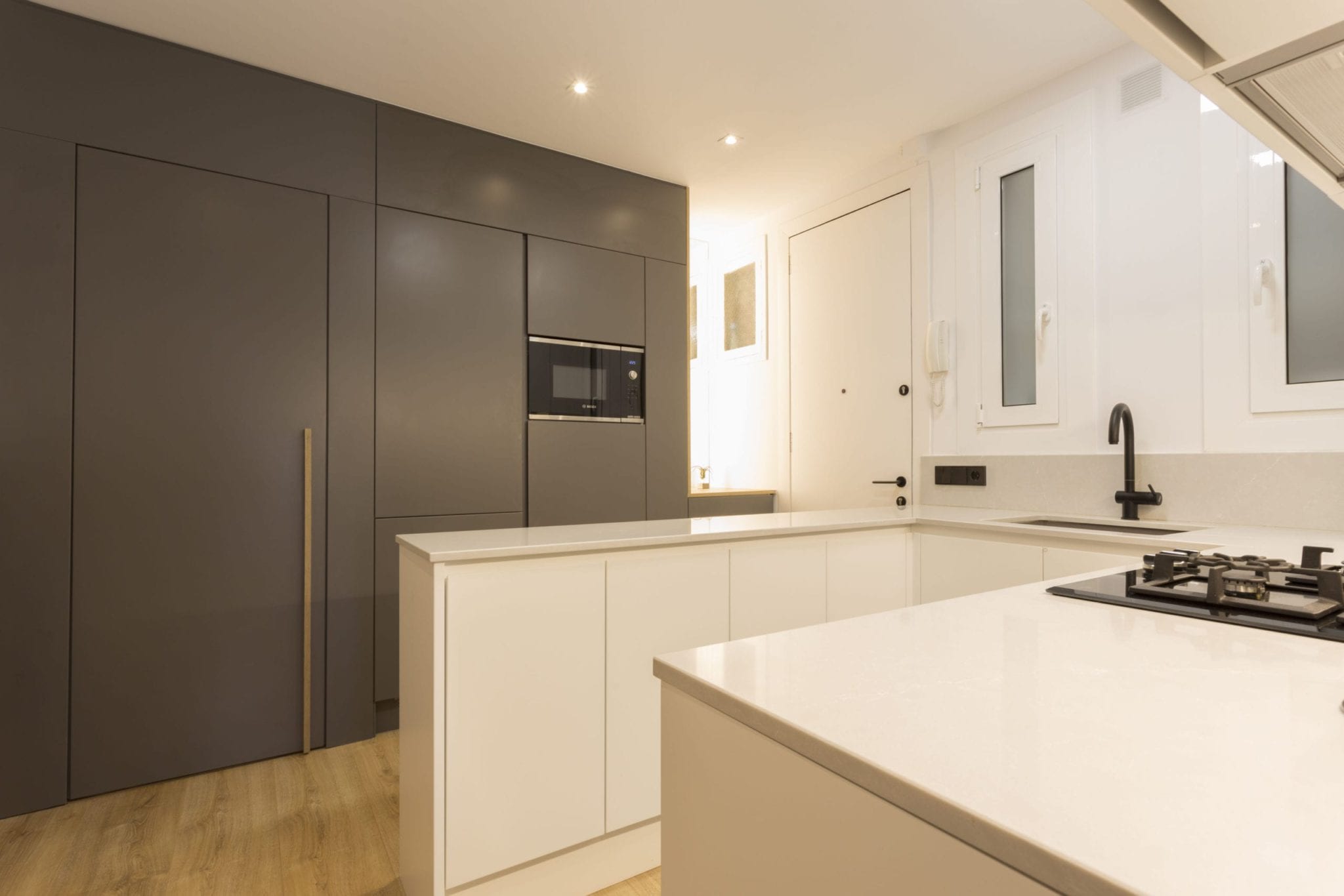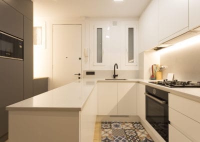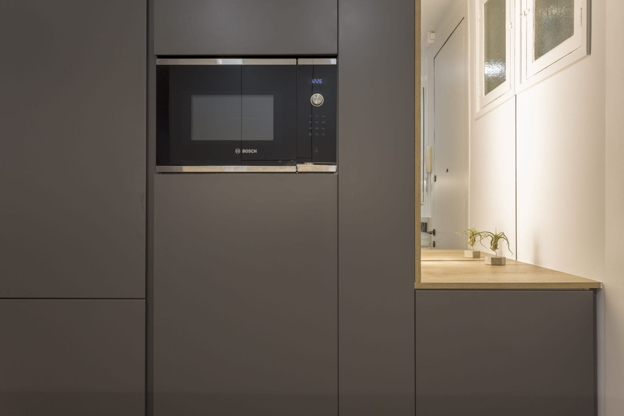 Una altra de les estancies que també ens conquesta, és la cuina. Aquesta totalment equipada, amb els electrodomèstics integrats en un mobiliari blanc lacat preciós, molt espai d’emmagatzematge, una distribució molt pràctica amb barra estil americà, dividint l’espai, alhora que resulta un element molt funcional. A més dels armaris de paret de tonalitat antracita fosc mate amb el microones integrat. La alfombra del terre d’estil mosaic hidràulic a la zona central acaba de fusionar totes les tonalitats i li dóna a la cuina la calidesa que necessita.