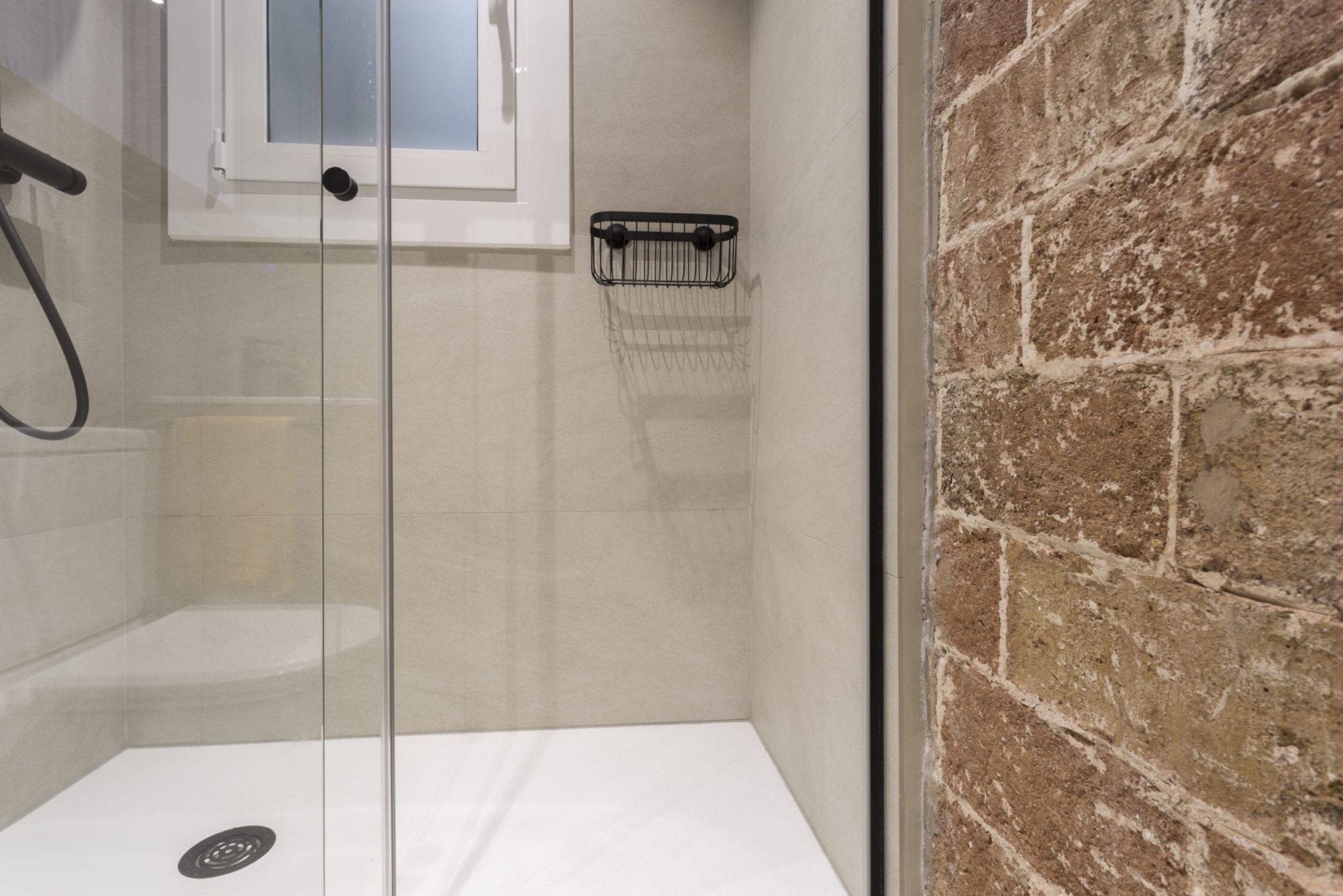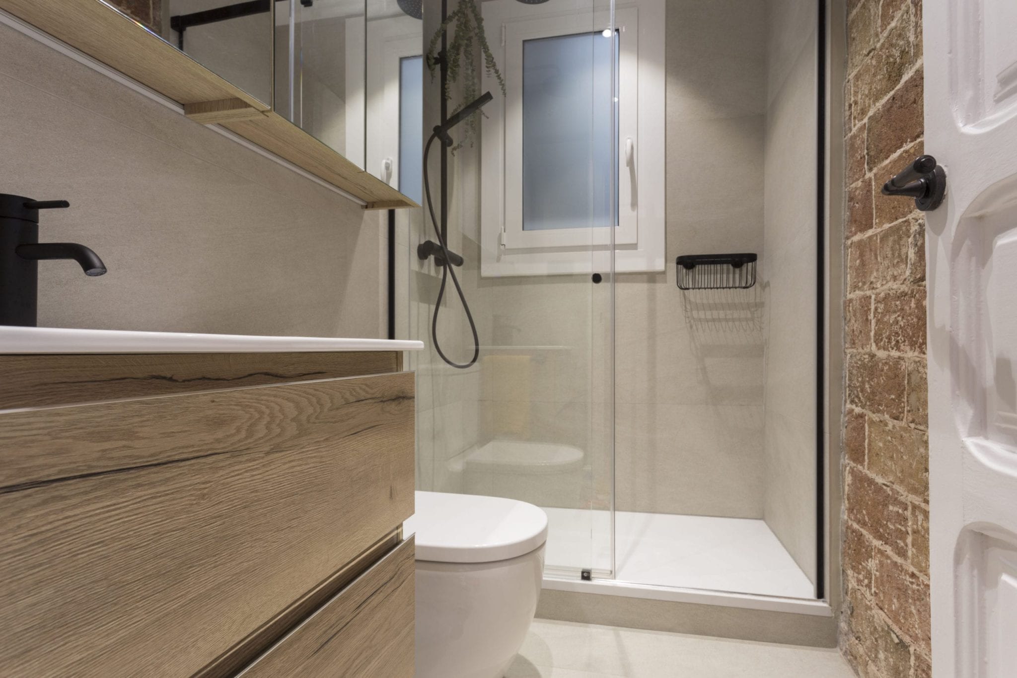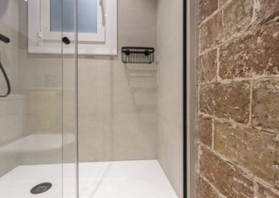En els banys, s’emporten el clar protagonisme la paret de pedra i les aixetes i accessoris en negre, li donen un toc rústic que encaixa molt bé amb l’estil de l’habitatge i el seu entorn.