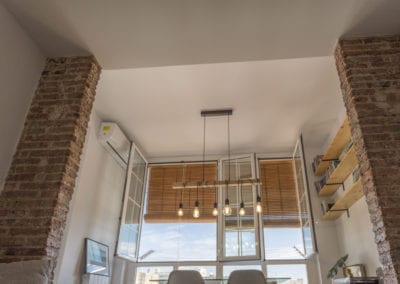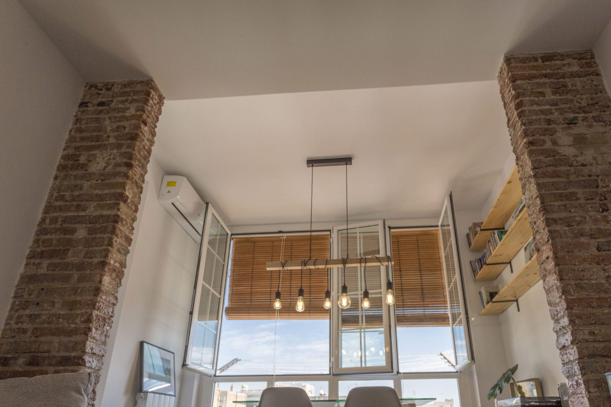 El menjador, minimalista i amb el mateix aire fresc i eco de tot l’habitatge, destaca pels seus dos ambients diferenciats, els maons vistos dels pilars, els grans finestrals que banyen de llum tot el saló menjador, i la il·luminació de disseny feta de materials naturals.