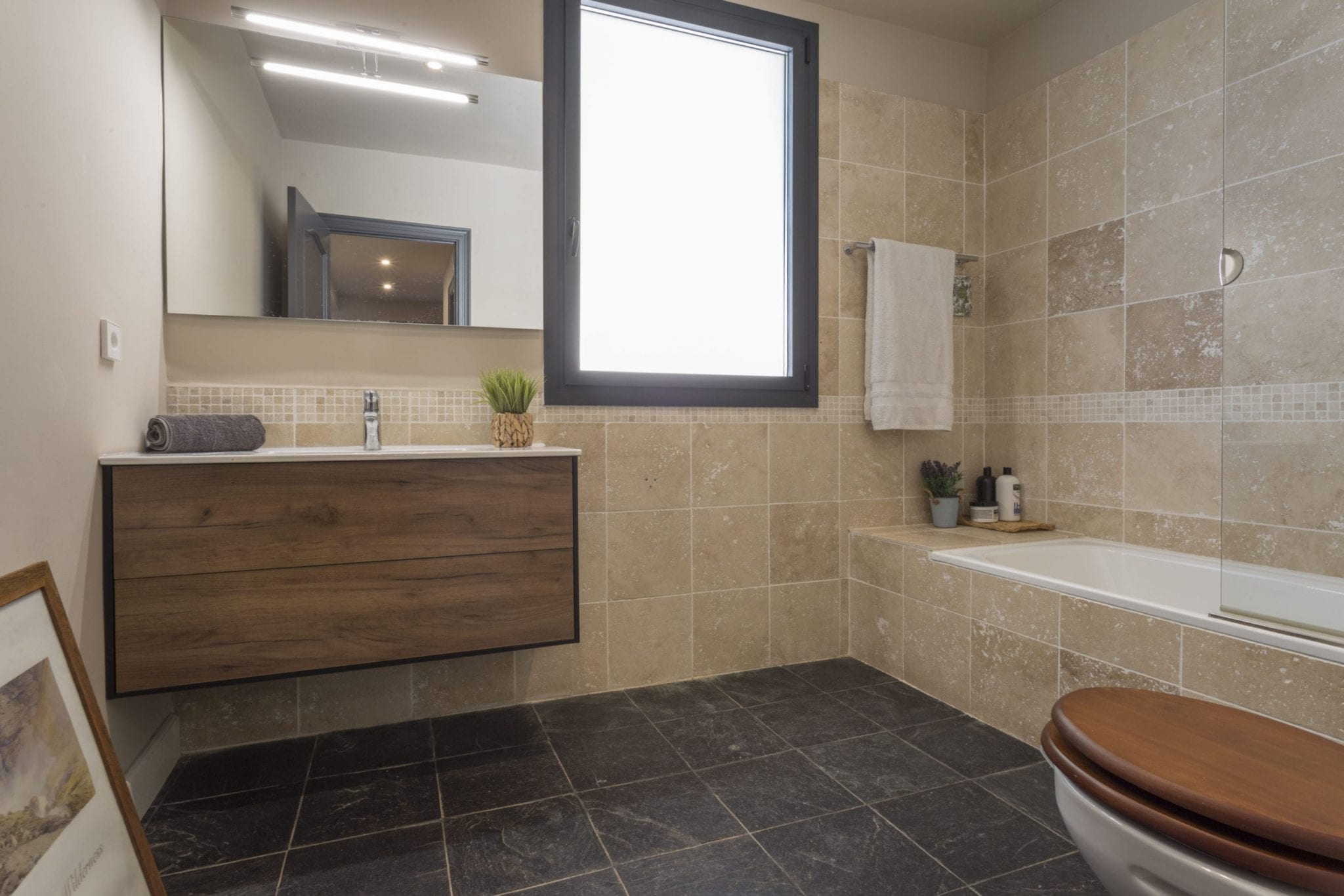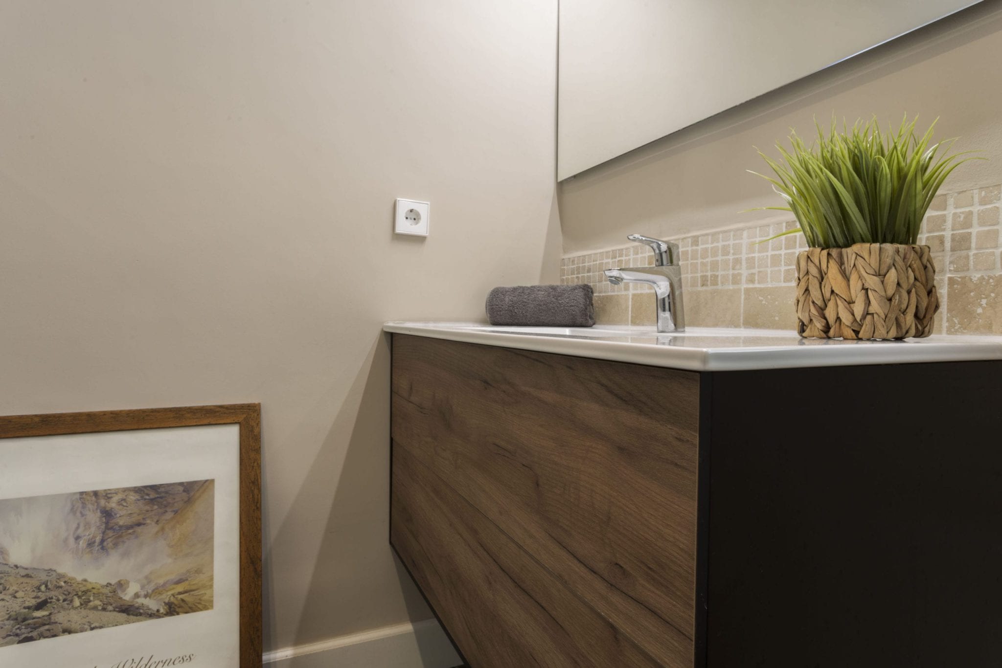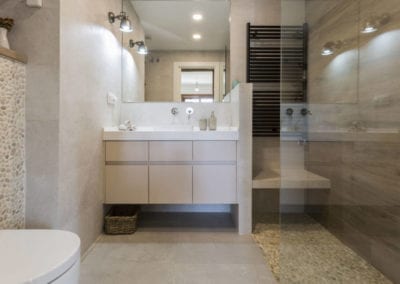 En els banys, trobem unes rajoles texturades, amb mosaic de gresite en el centre. El mobiliari de fusta i un gran mirall donen llum a tot l’espai.