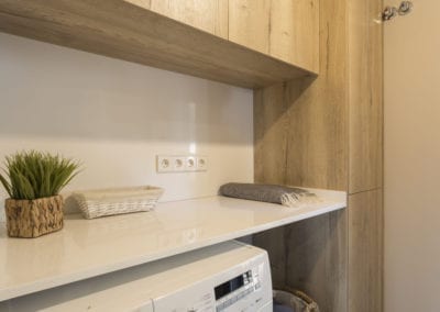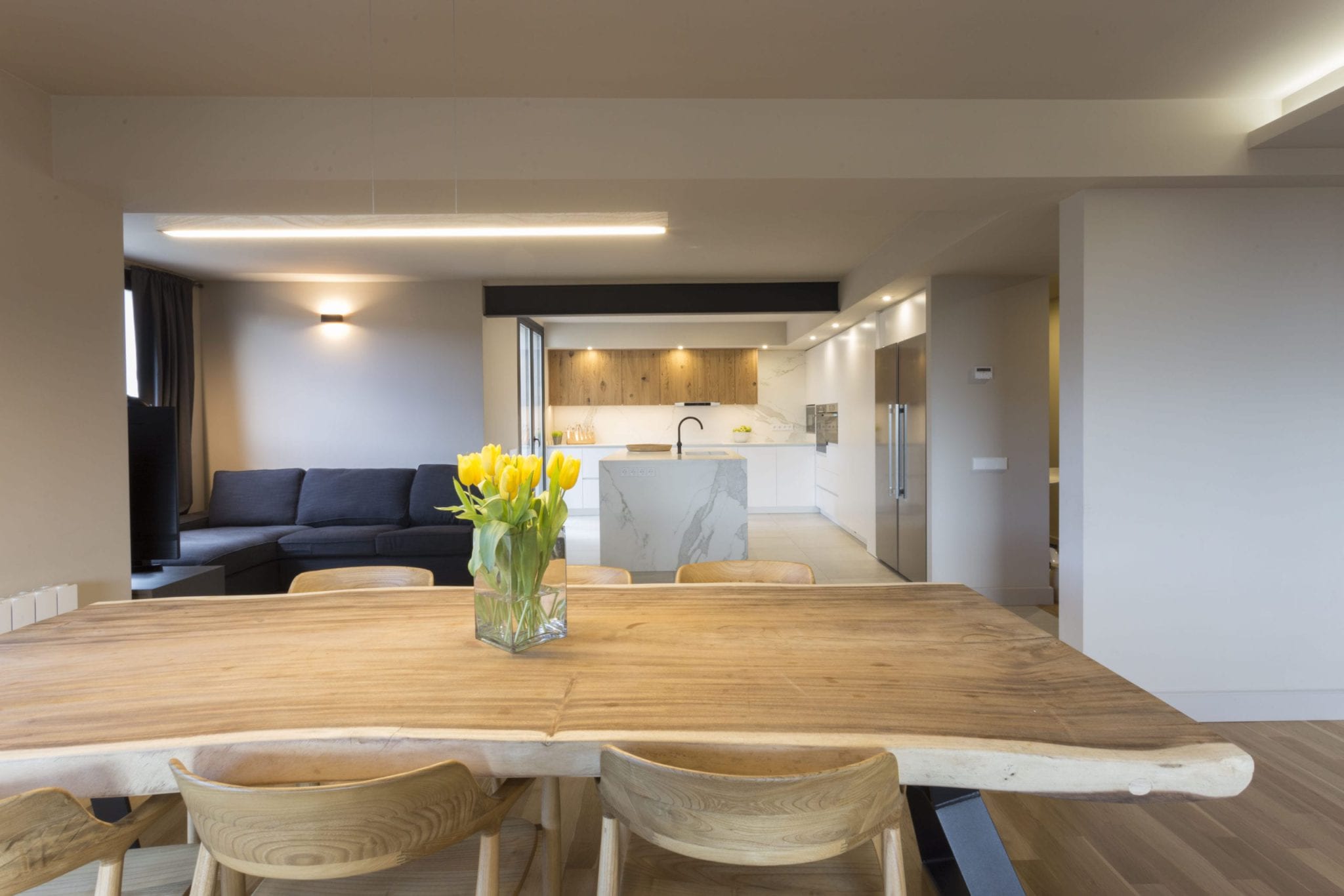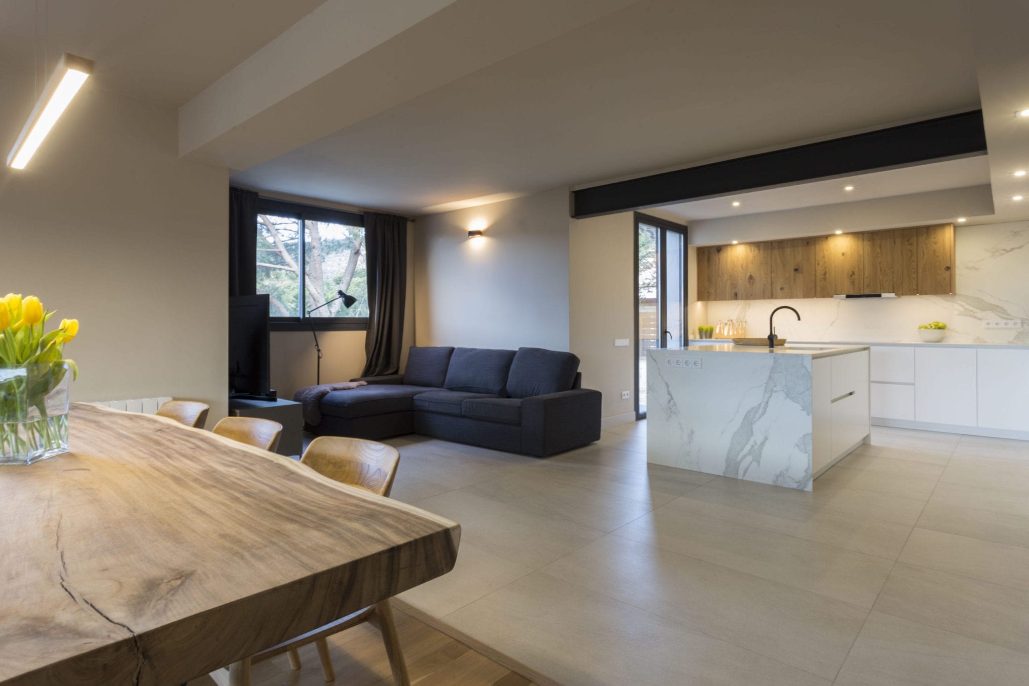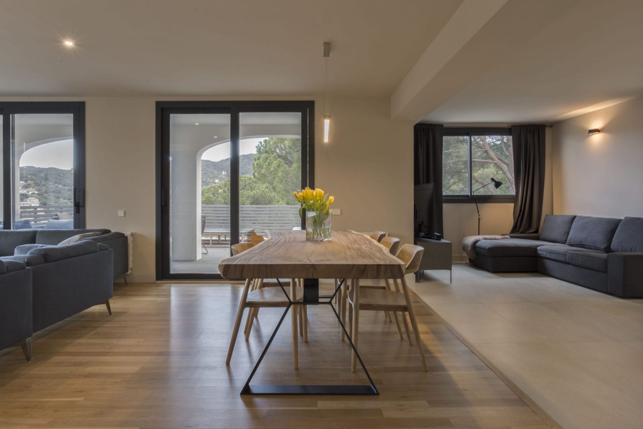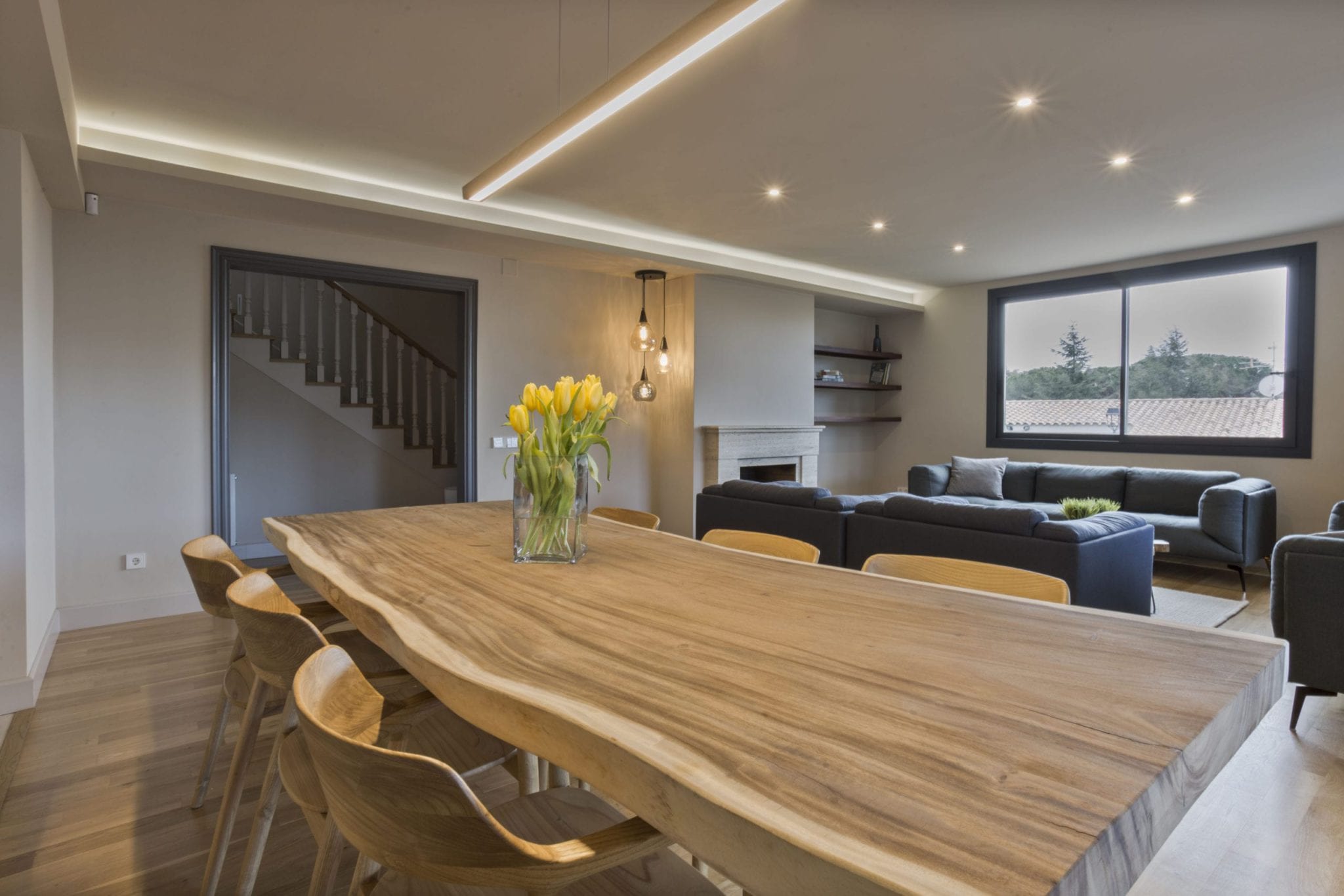 Aprofitant tot l’espai de la zona de més activitat en la llar, s’ha creat un ambient diàfan amb un saló menjador en dos nivells, amb parquet natural preciós i la fusta com a principal protagonista. Els elements que més destaquen són el contrast de grisos dels tancaments a conjunt amb sofà i cortines, destacant sobre l’ambient suau i càlid que ofereix la fusta. Unes flors fresques harmonitzen tot l’espai i li aporten calidesa de llar.