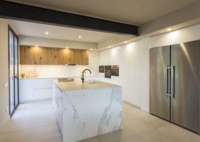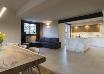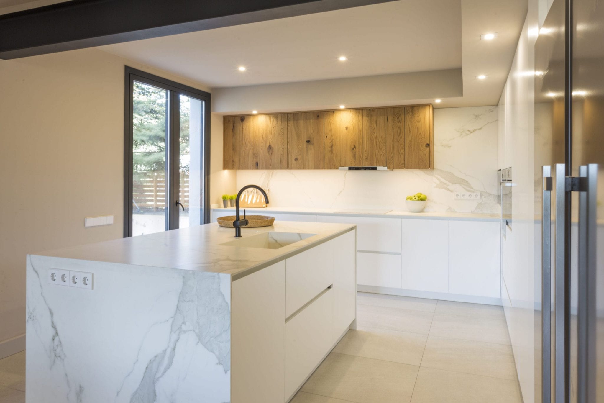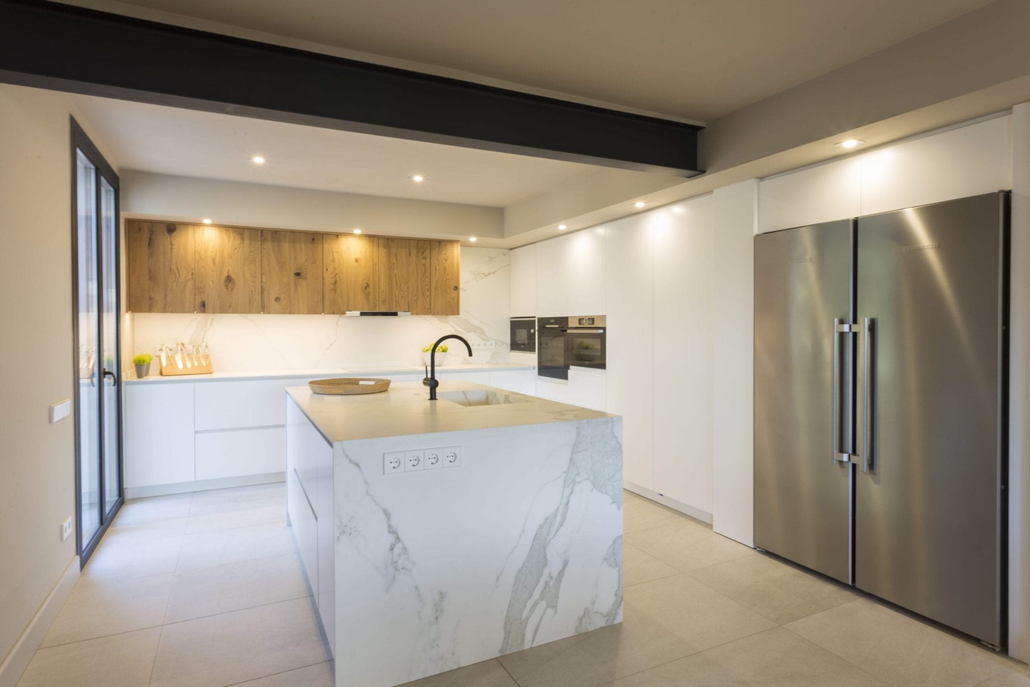 Per a diferenciar la cuina del menjador, trobem una biga d’acer en la mateixa tonalitat grisa dels tancaments, donant-li un petit toc industrial que se suavitza amb la fantàstica il·luminació de la cuina, la claredat del blanc i la suau textura de marbre de l’illa central, que també, integra espai d’emmagatzematge.