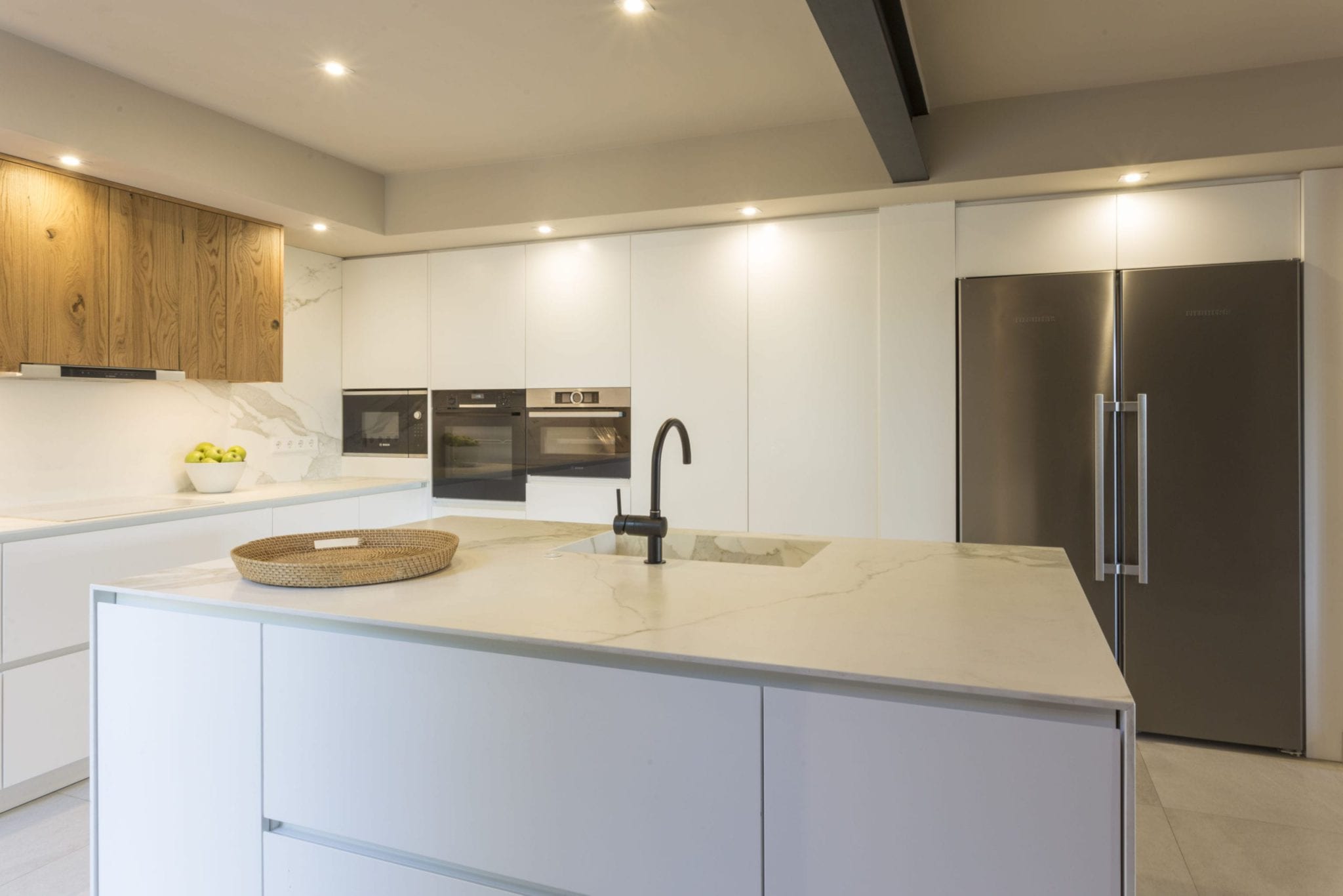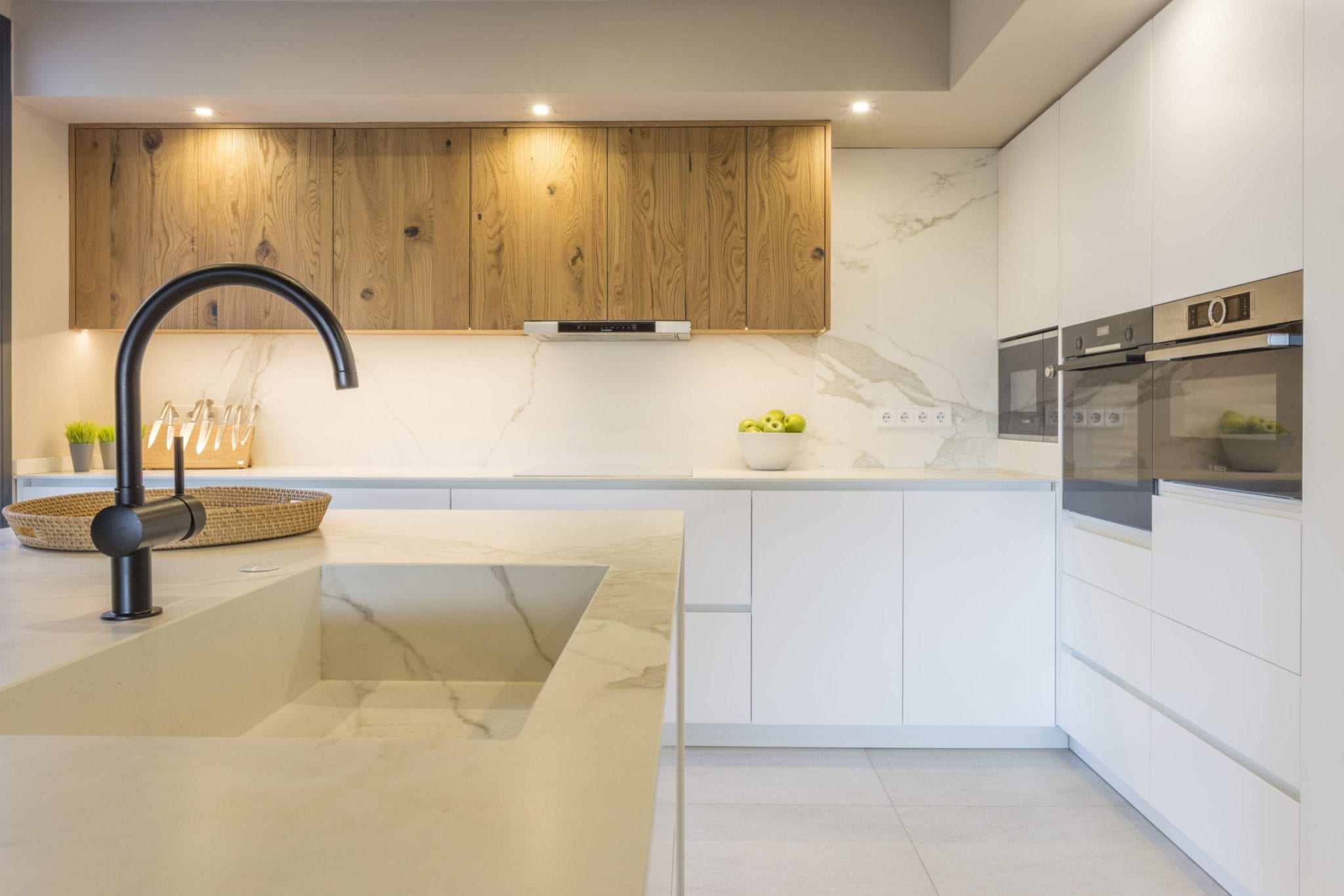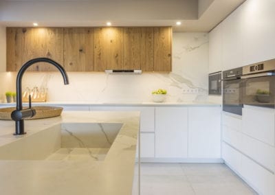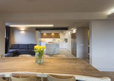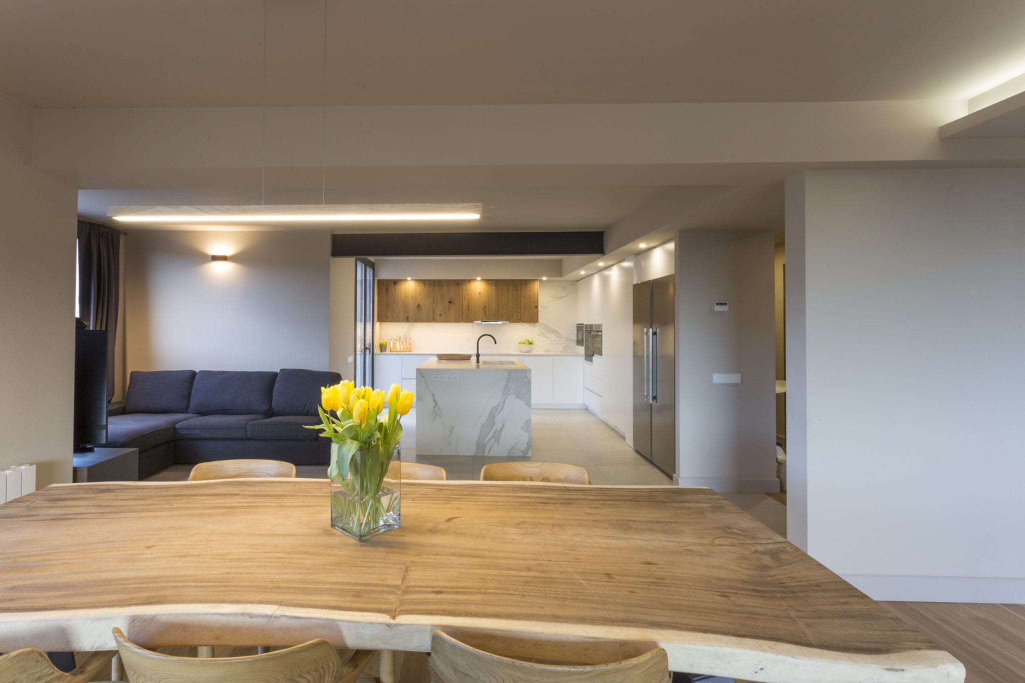 Per a diferenciar la cuina del menjador, trobem una biga d’acer en la mateixa tonalitat grisa dels tancaments, donant-li un petit toc industrial que se suavitza amb la fantàstica il·luminació de la cuina, la claredat del blanc i la suau textura de marbre de l’illa central, que també, integra espai d’emmagatzematge.