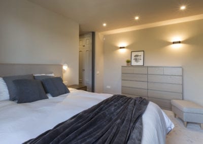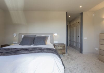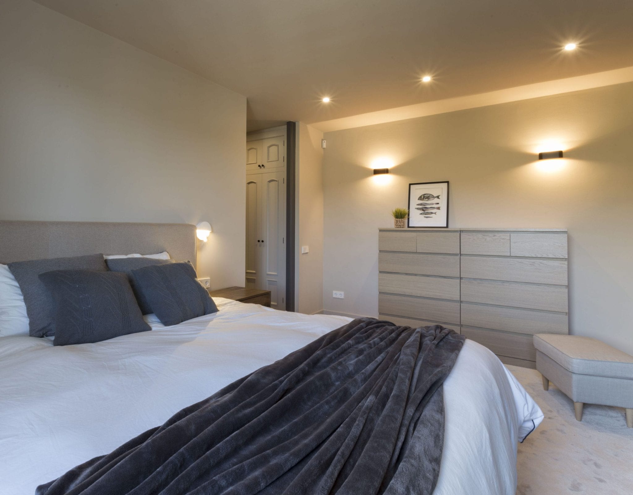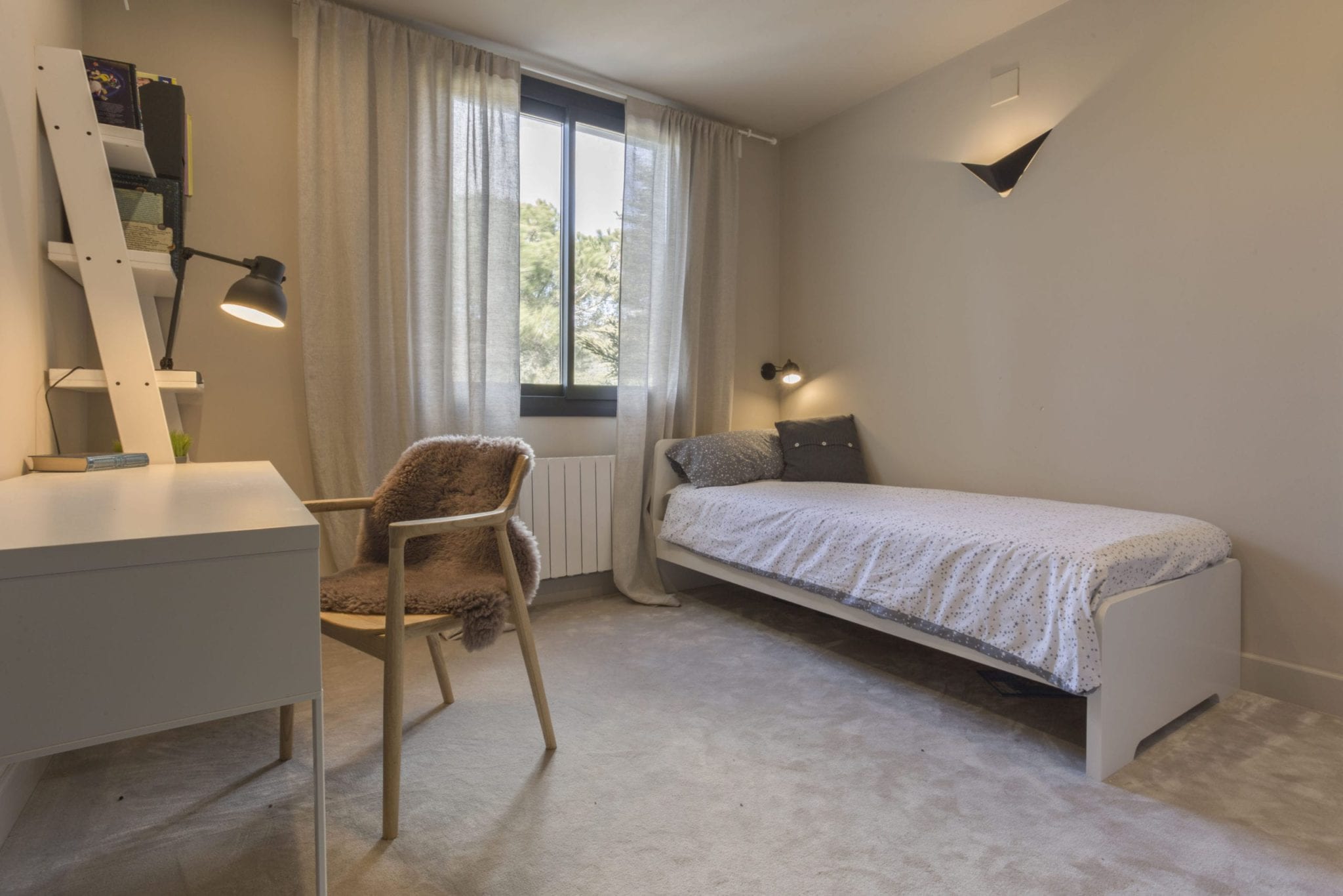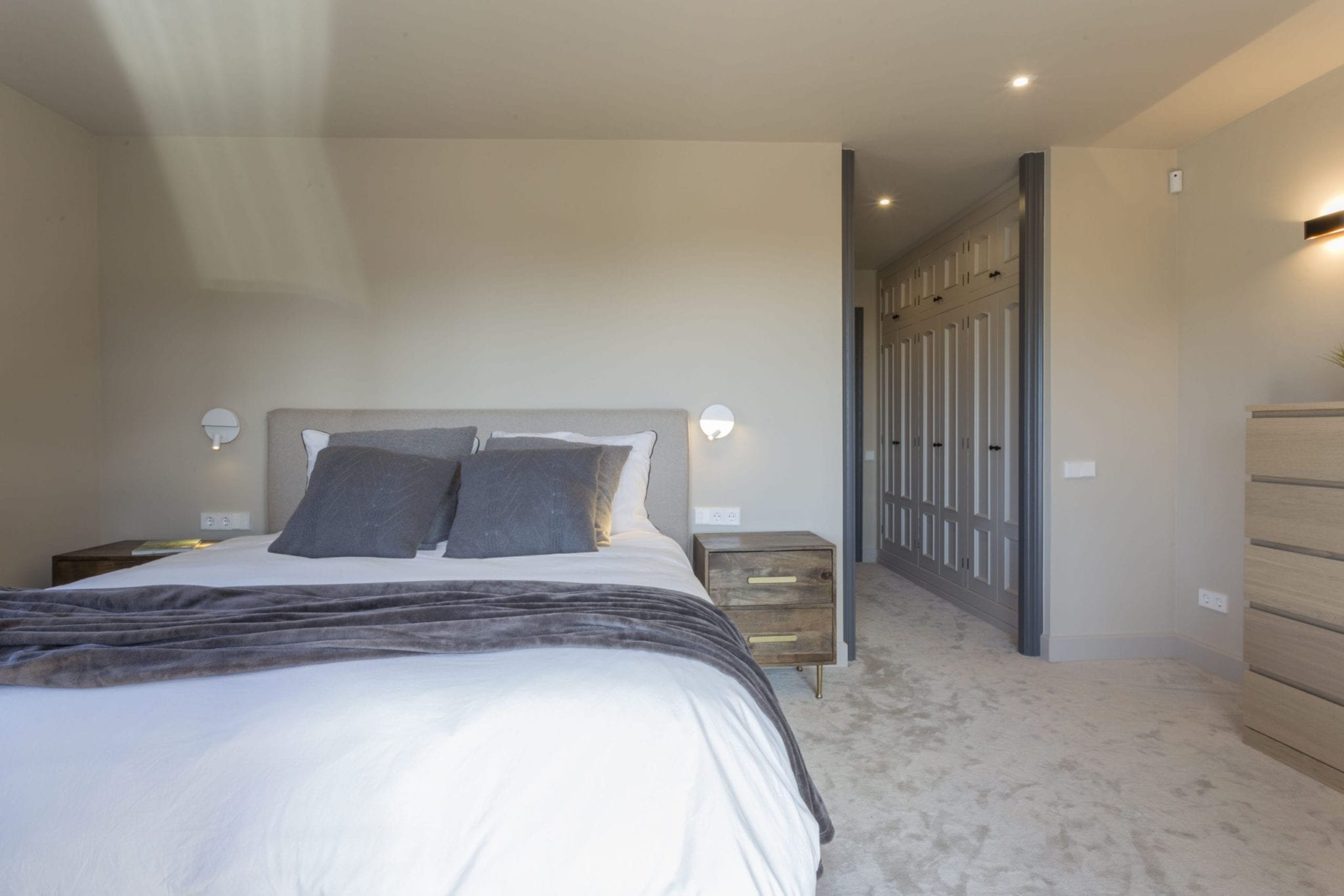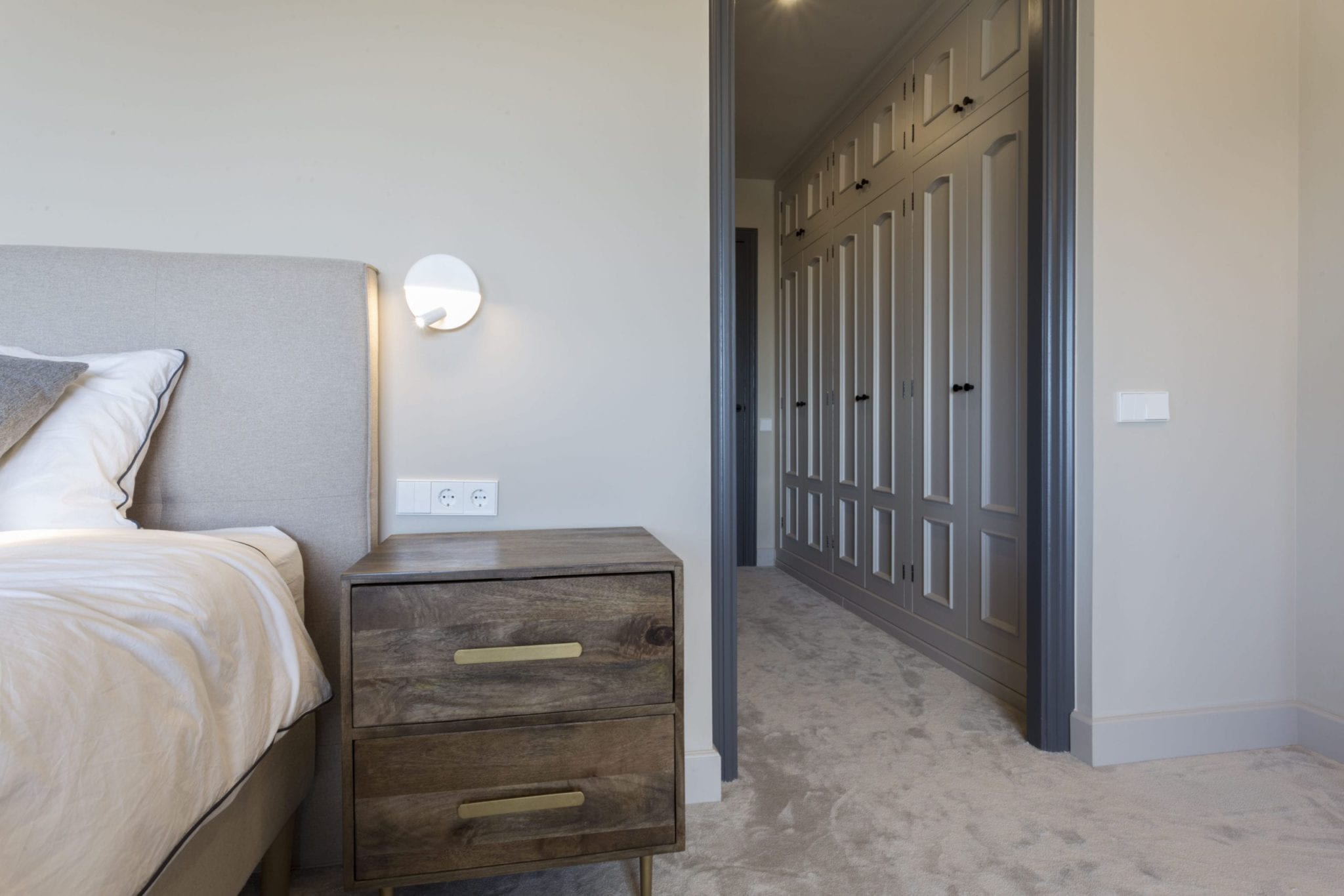 A l’habitació principal, banyada de llum natural, amb cortines, tancaments i portes en la jugant a contrastar amb les tonalitats de grises que destaquen a la perfecció entre l’elegància i calidesa de la fusta.