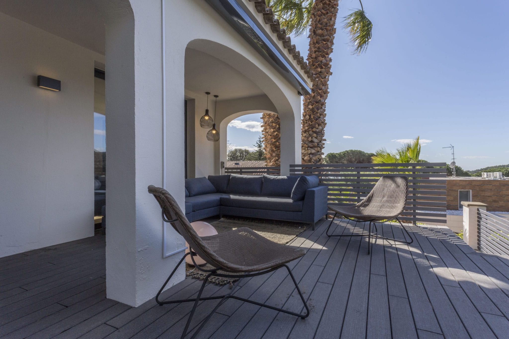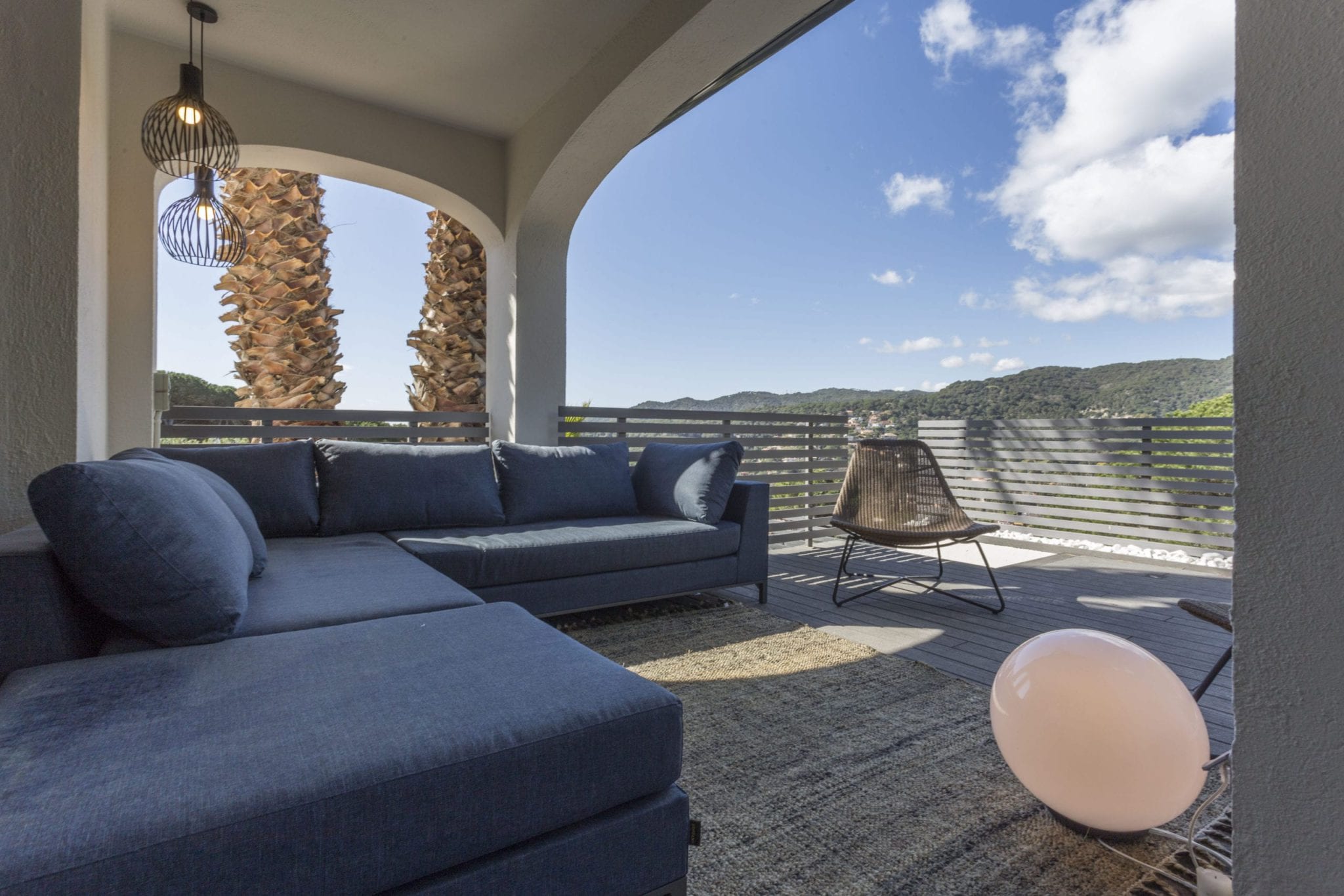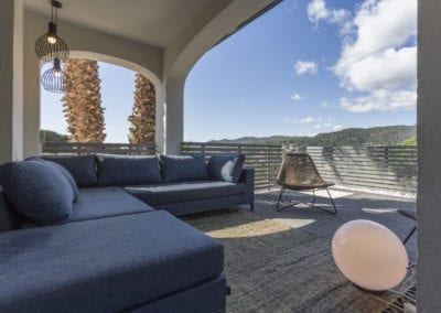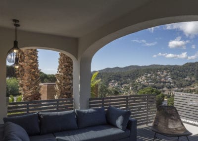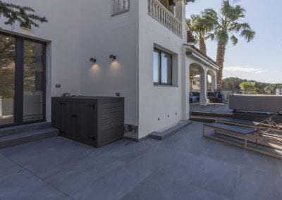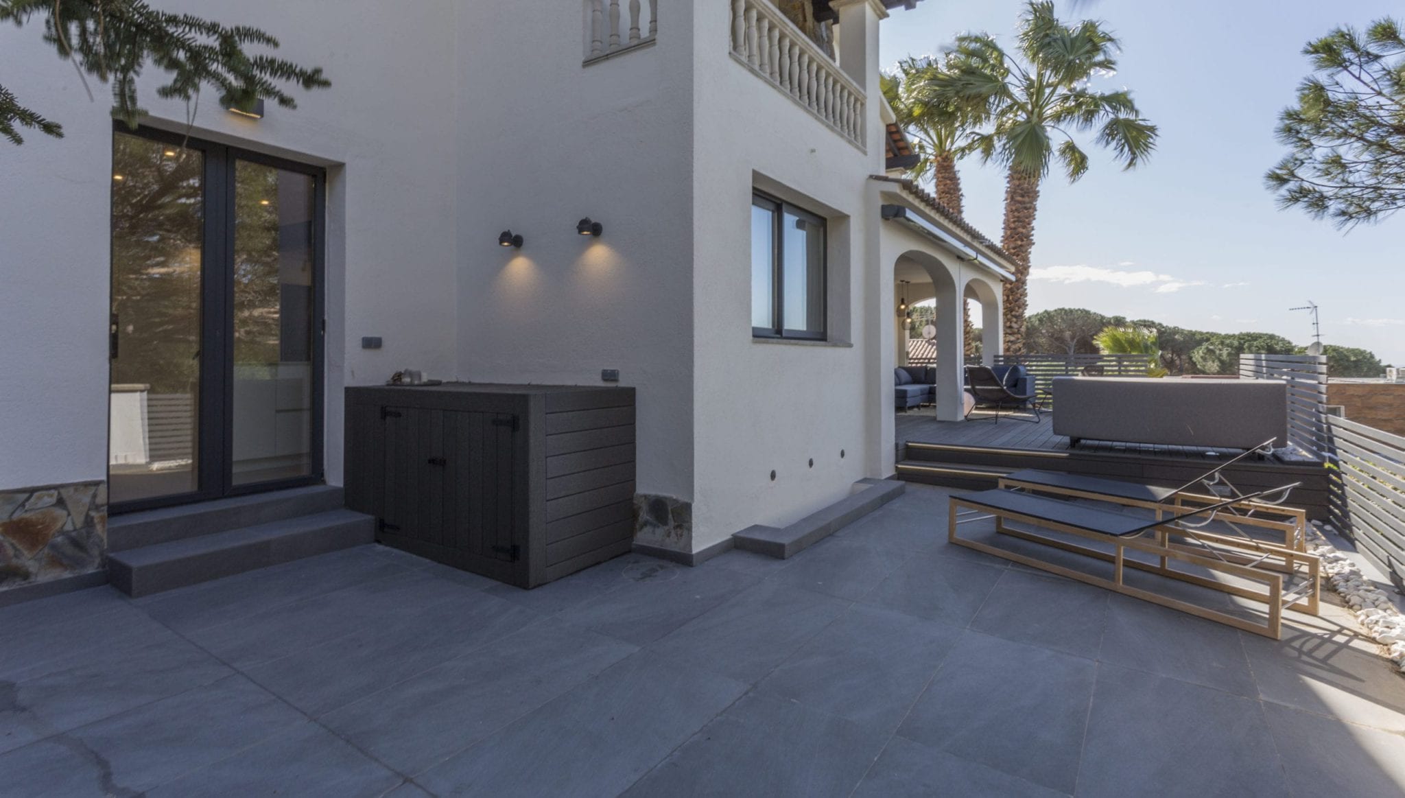 En les zones exteriors, trobem una terrassa capaç de traslladar-nos a aquells chillouts de qualsevol tarda fresca enfront de la mar. Les lluminàries de disseny, encaixen perfectament amb el material de les cadires i el color dels sofàs d’exterior.