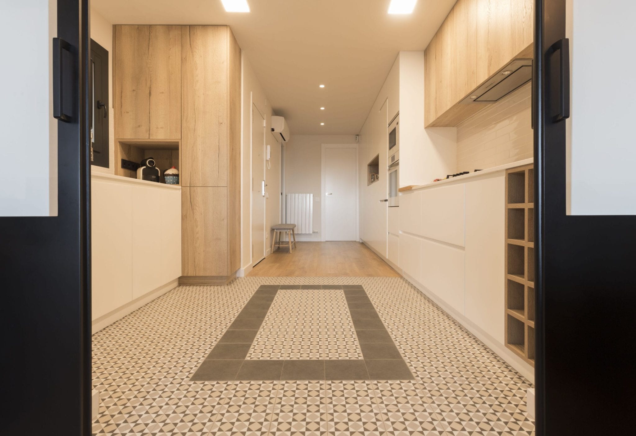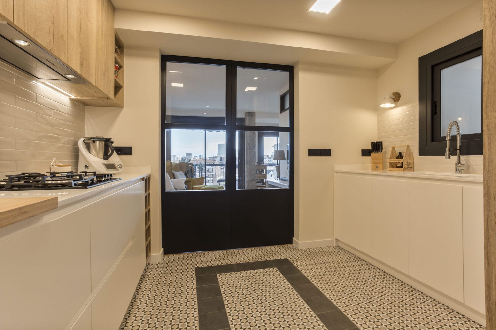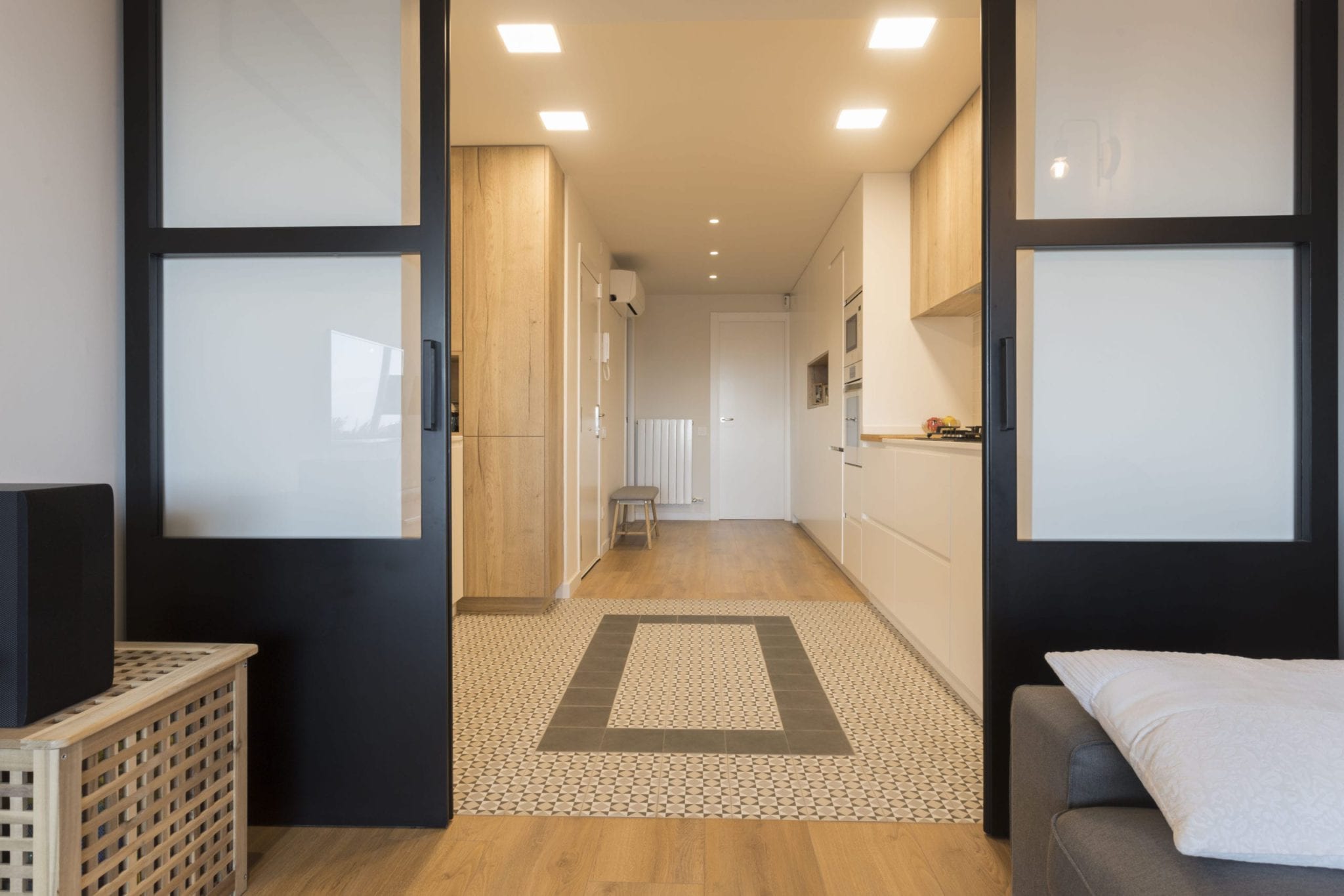 Començant pel saló menjador, trobem diversos elements que destaquen i omplen de caràcter l’estança, com poden ser, les portes corredisses de guia vista en fusta a la qual se li ha donat una tonalitat negra que simula un acabat en ferro, en la qual, a més, s’han incorporat marcs de vidre per a facilitar i maximitzar l’entrada de llum natural a la cuina.