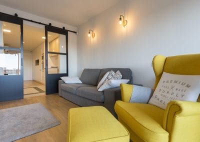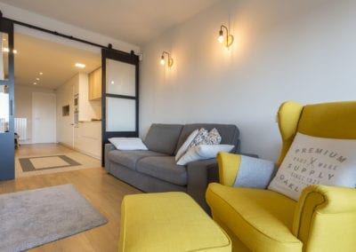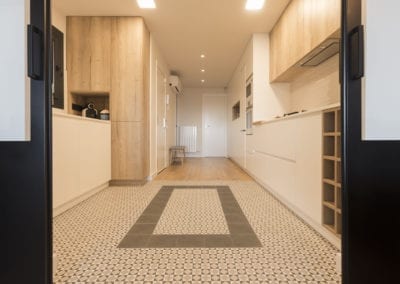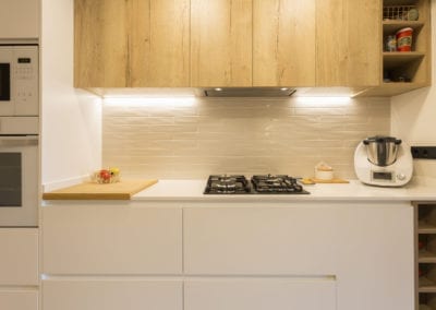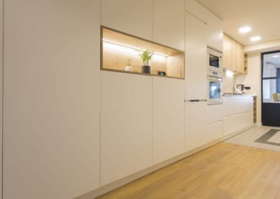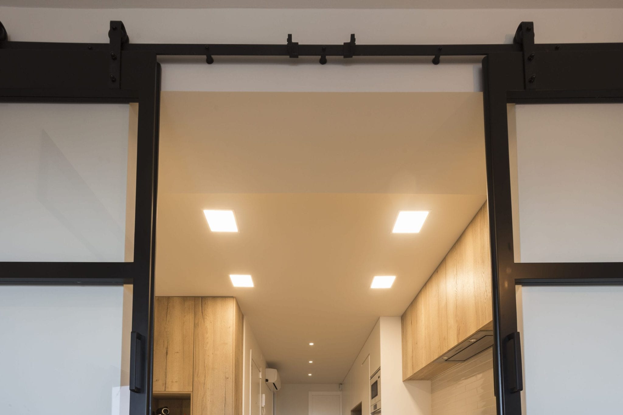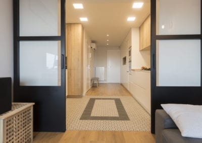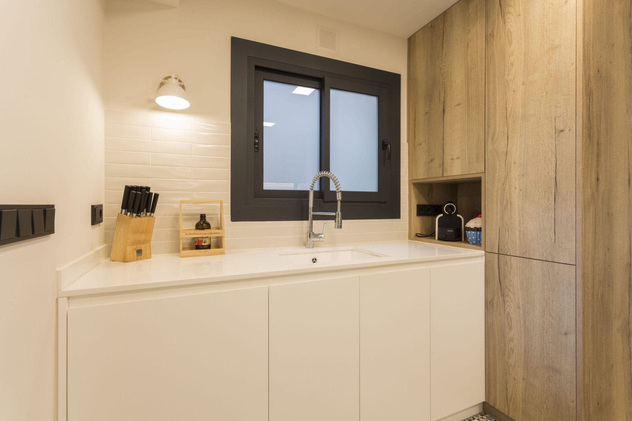 Començant pel saló menjador, trobem diversos elements que destaquen i omplen de caràcter l’estança, com poden ser, les portes corredisses de guia vista en fusta a la qual se li ha donat una tonalitat negra que simula un acabat en ferro, en la qual, a més, s’han incorporat marcs de vidre per a facilitar i maximitzar l’entrada de llum natural a la cuina.