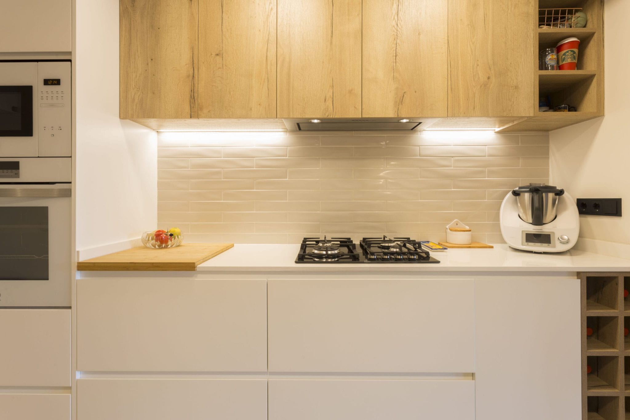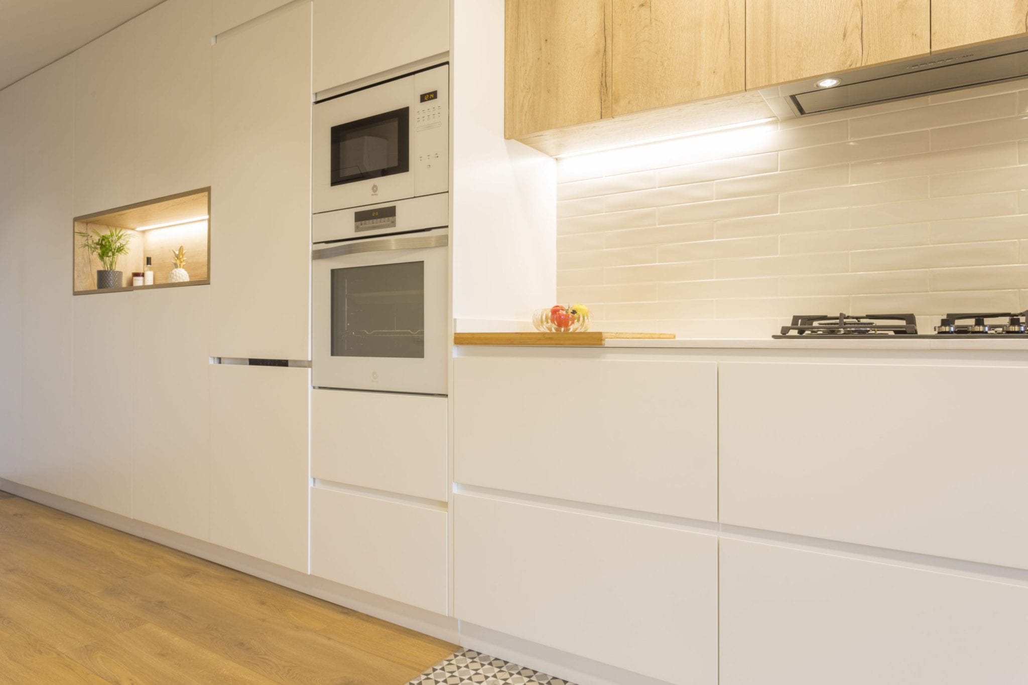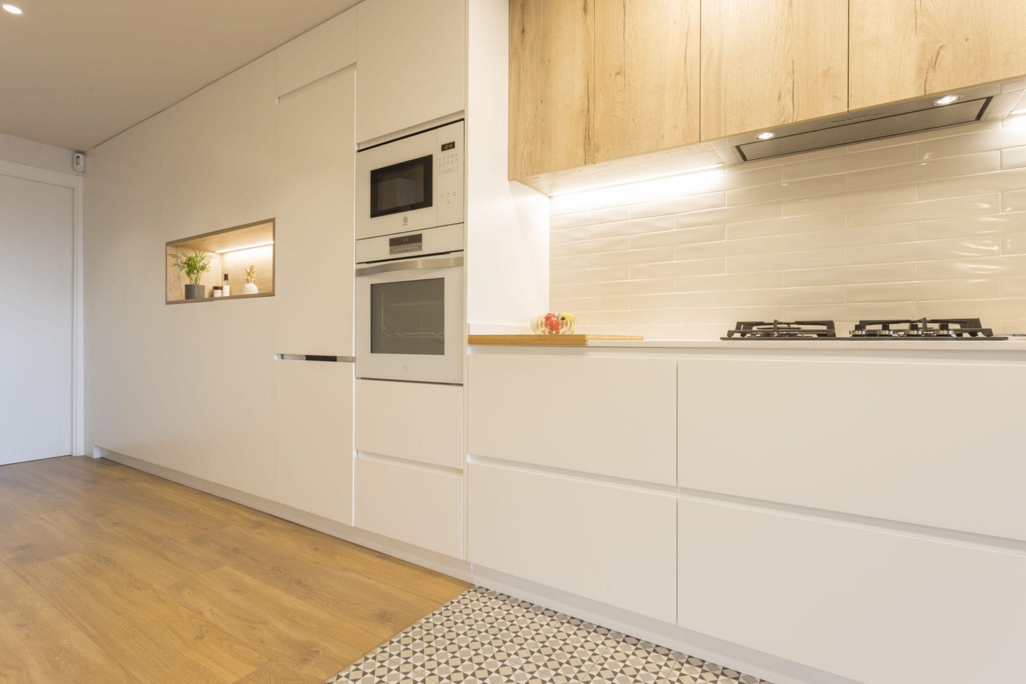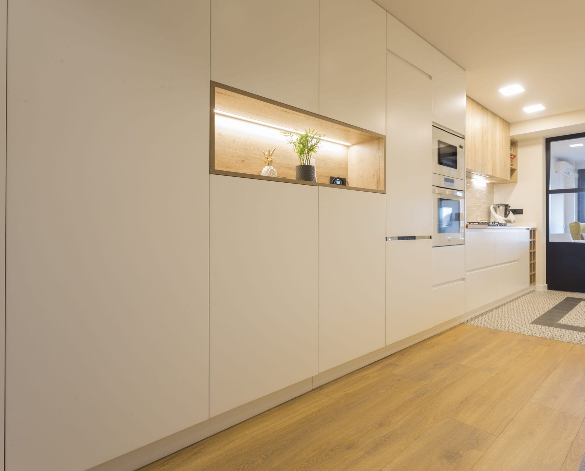 En la cuina, hem jugat amb les textures del terre per a separar els ambients. Un terre preciós de mosaic i el parquet laminat de fusta clara es combinen a la perfecció. El mobiliari blanc amb els electrodomèstics excel·lentment integrats li dóna un aspecte net, clar i elegant.