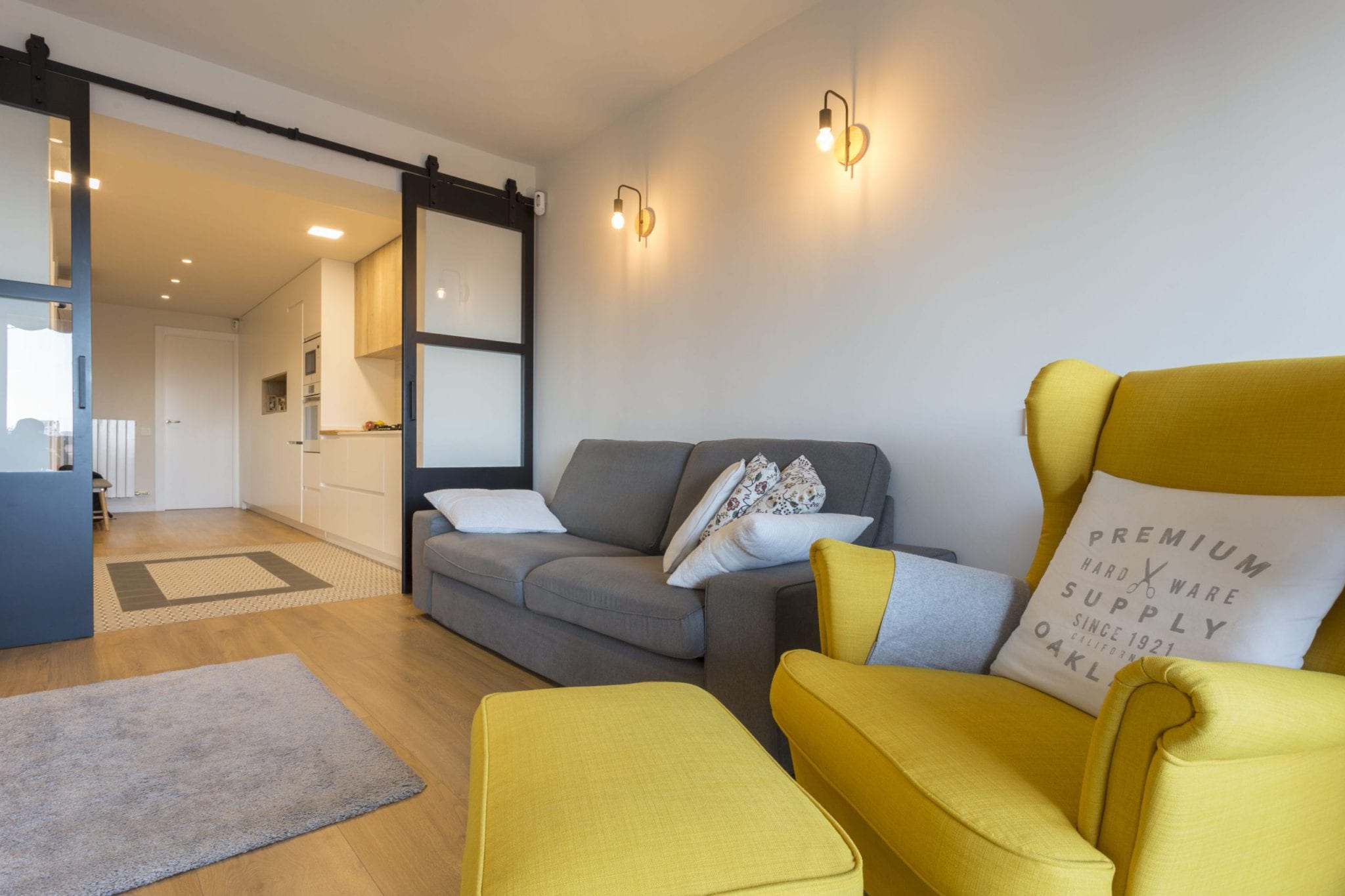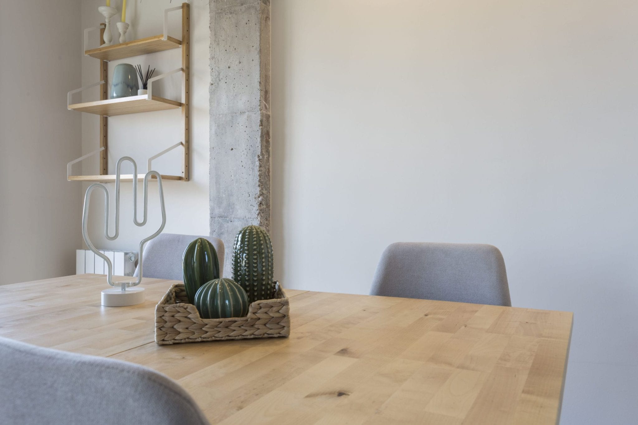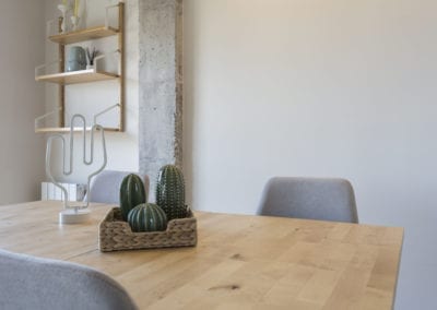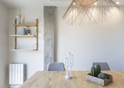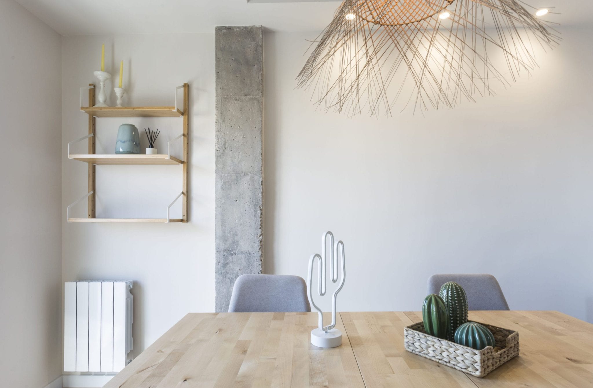 Un altre dels elements estructurals que més destaquen és la biga vista del menjador que, visualment, li aporta un toc industrial suavitzat amb els colors neutres de les parets, el mobiliari en fusta clara i les cadires en gris suau de la mateixa tonalitat. A més, en el saló, incorporem una butaca en un to groc vibrant al costat del sofà gris amb elements decoratius més tendres que li donen un aspecte molt acollidor.