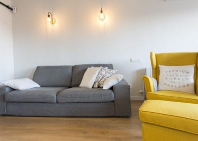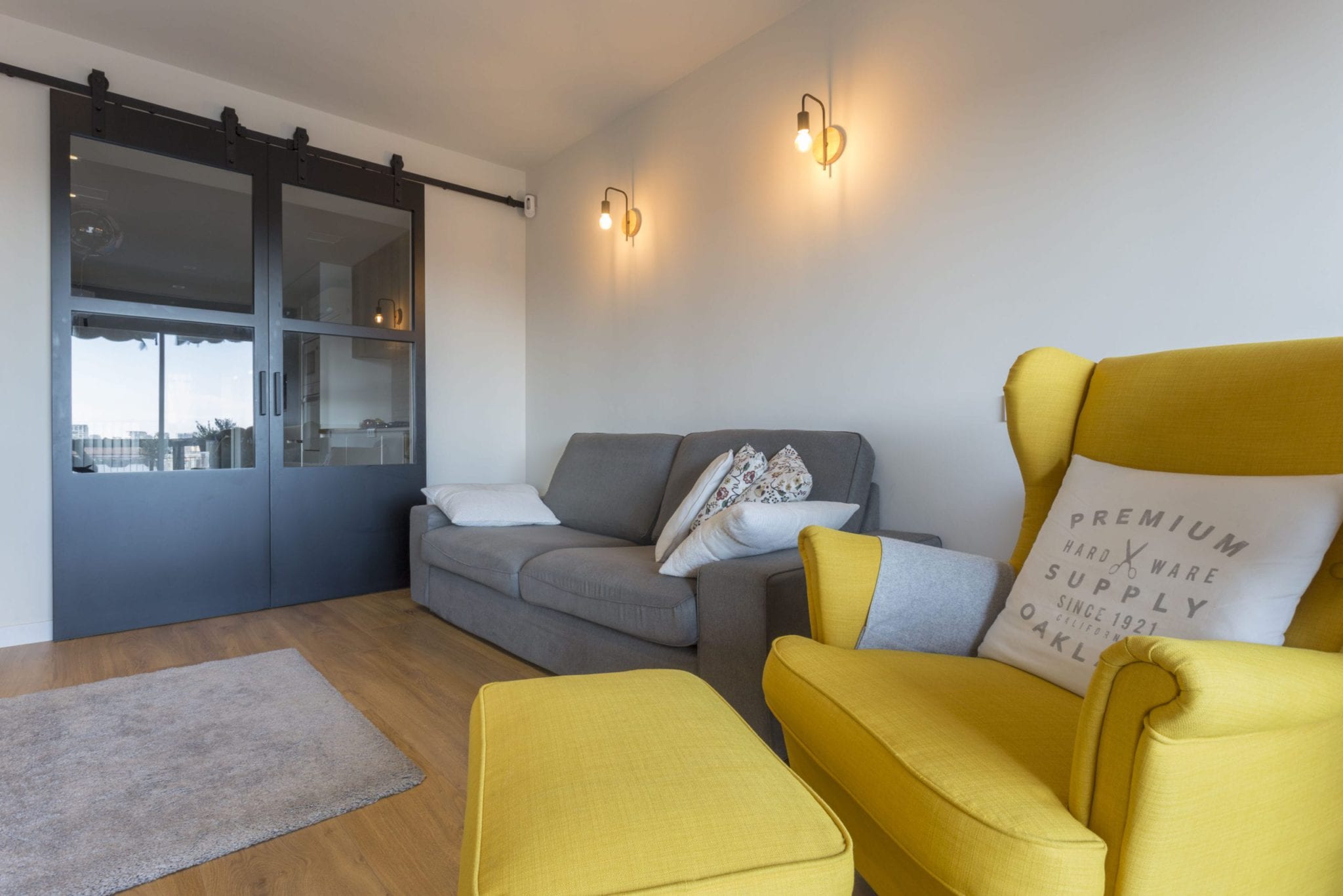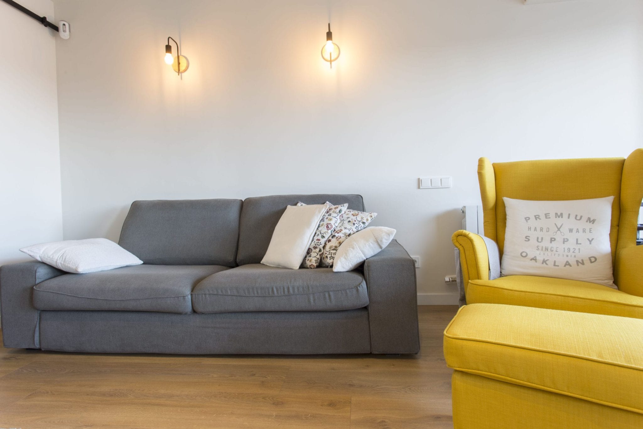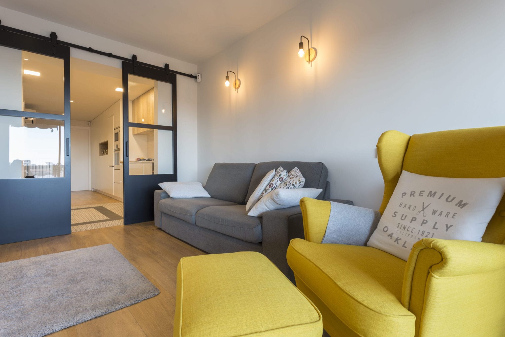 Un altre dels elements estructurals que més destaquen és la biga vista del menjador que, visualment, li aporta un toc industrial suavitzat amb els colors neutres de les parets, el mobiliari en fusta clara i les cadires en gris suau de la mateixa tonalitat. A més, en el saló, incorporem una butaca en un to groc vibrant al costat del sofà gris amb elements decoratius més tendres que li donen un aspecte molt acollidor.