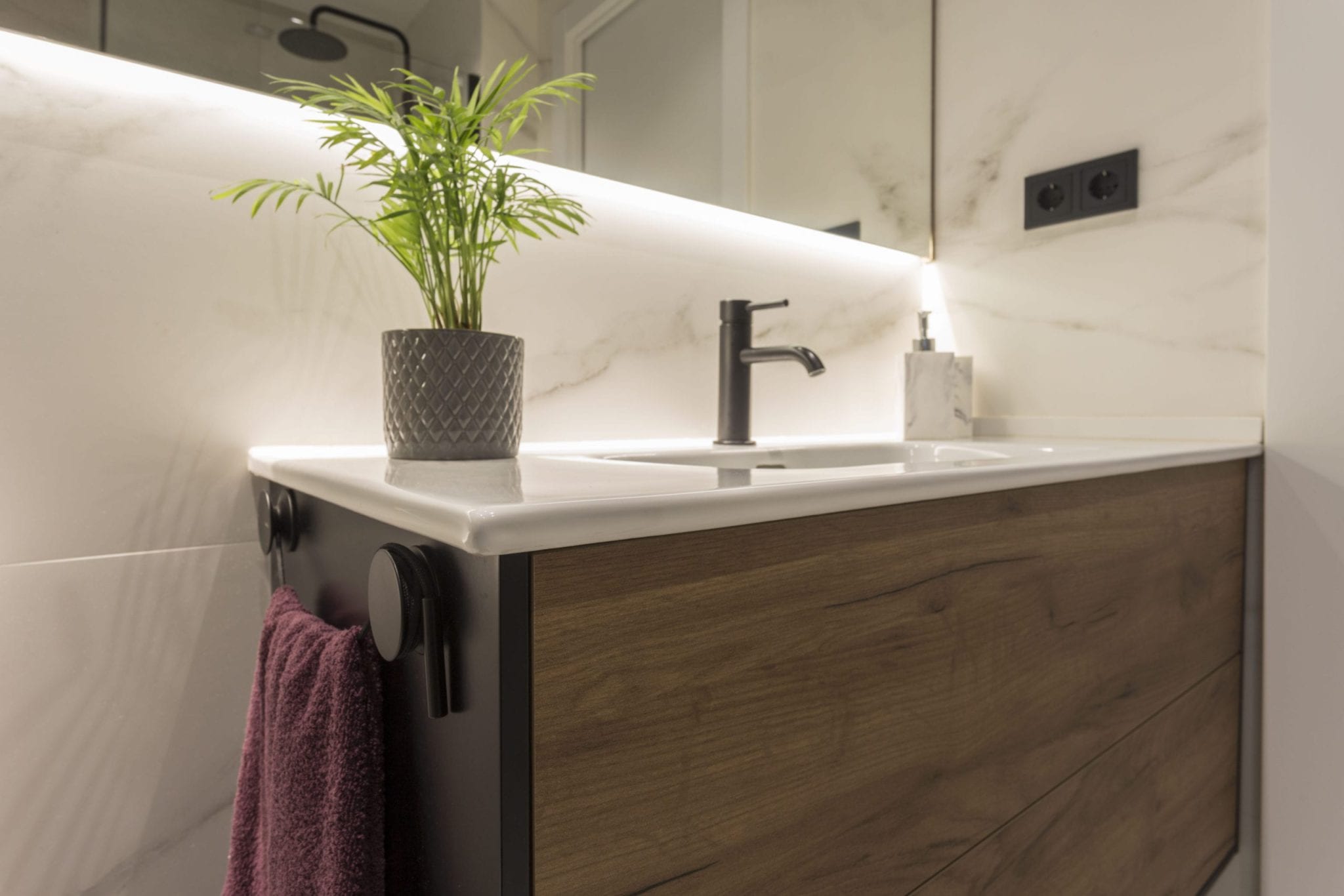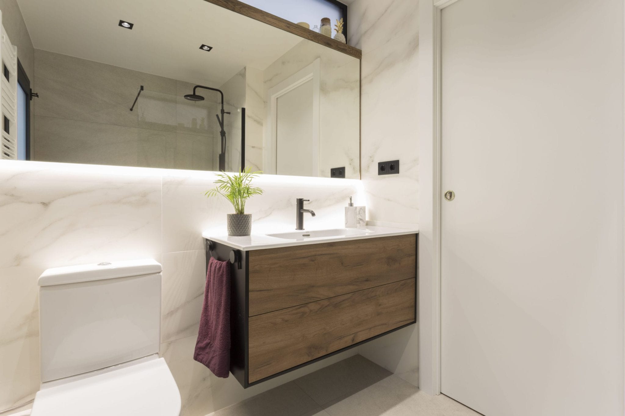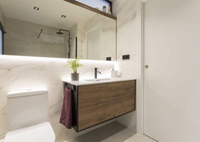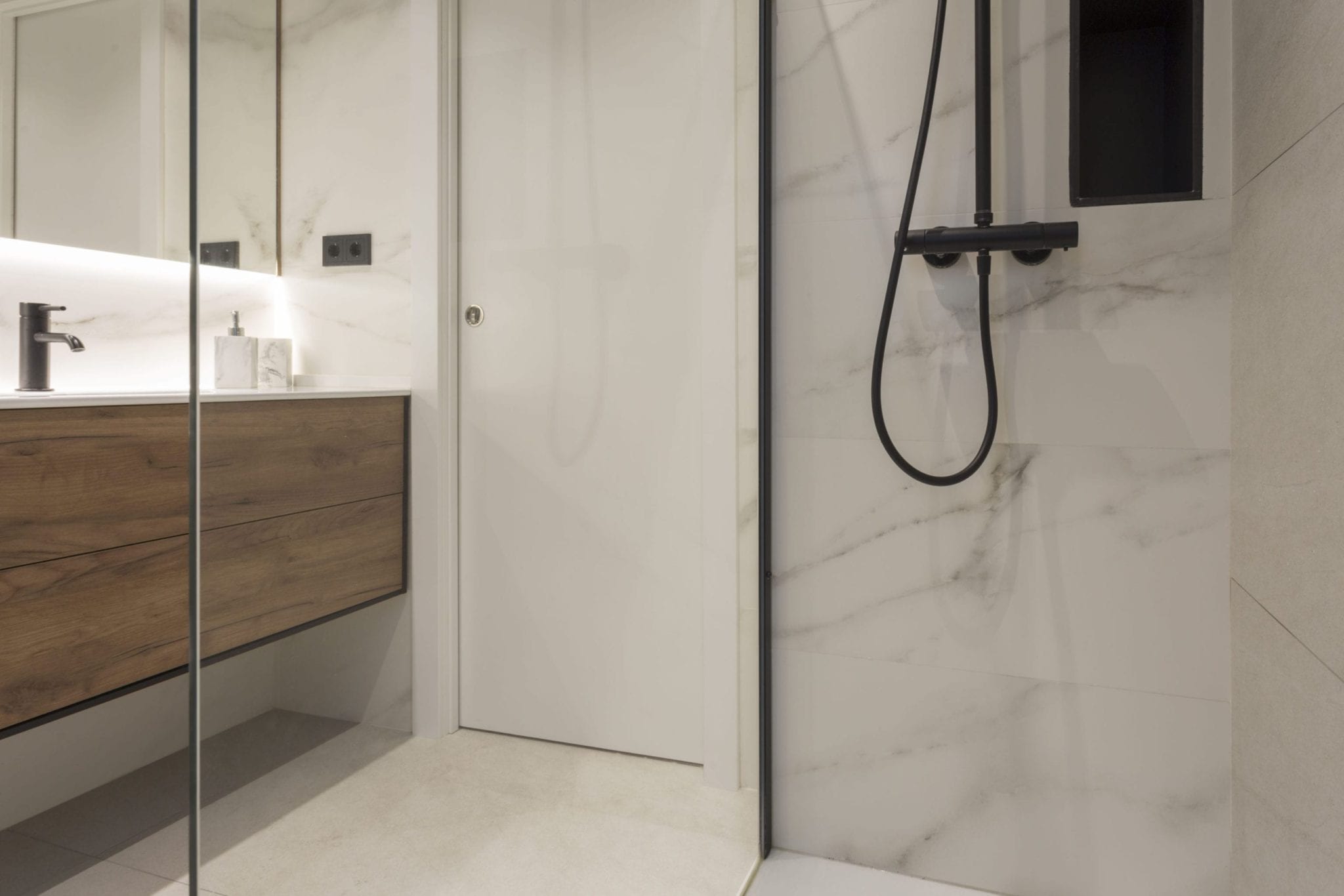 En els banys, s’ha apostat pel blanc com a protagonista, al costat de la fusta clara i materials nobles com el vidre, creant una gran mampara envidrada, perfecta per a crear la sensació d’amplitud necessària en espais reduïts. Contrasten, l’aixeteria negra i la fusteria dels tancaments, amb els colors suaus del bany i l’efecte amarmolat del revestiment de les parets, capaces de resistir la humitat produïda per la condensació de l’aigua calenta en el moment de la dutxa.
