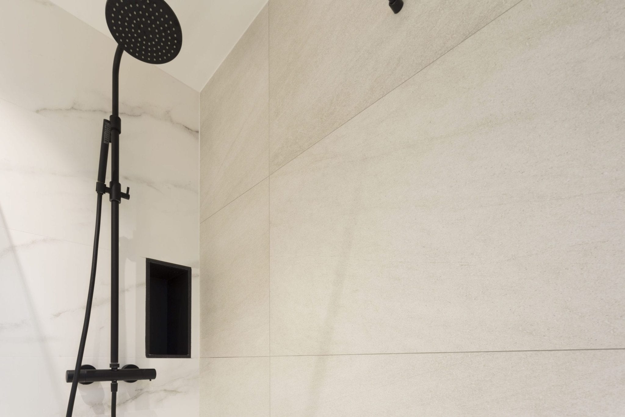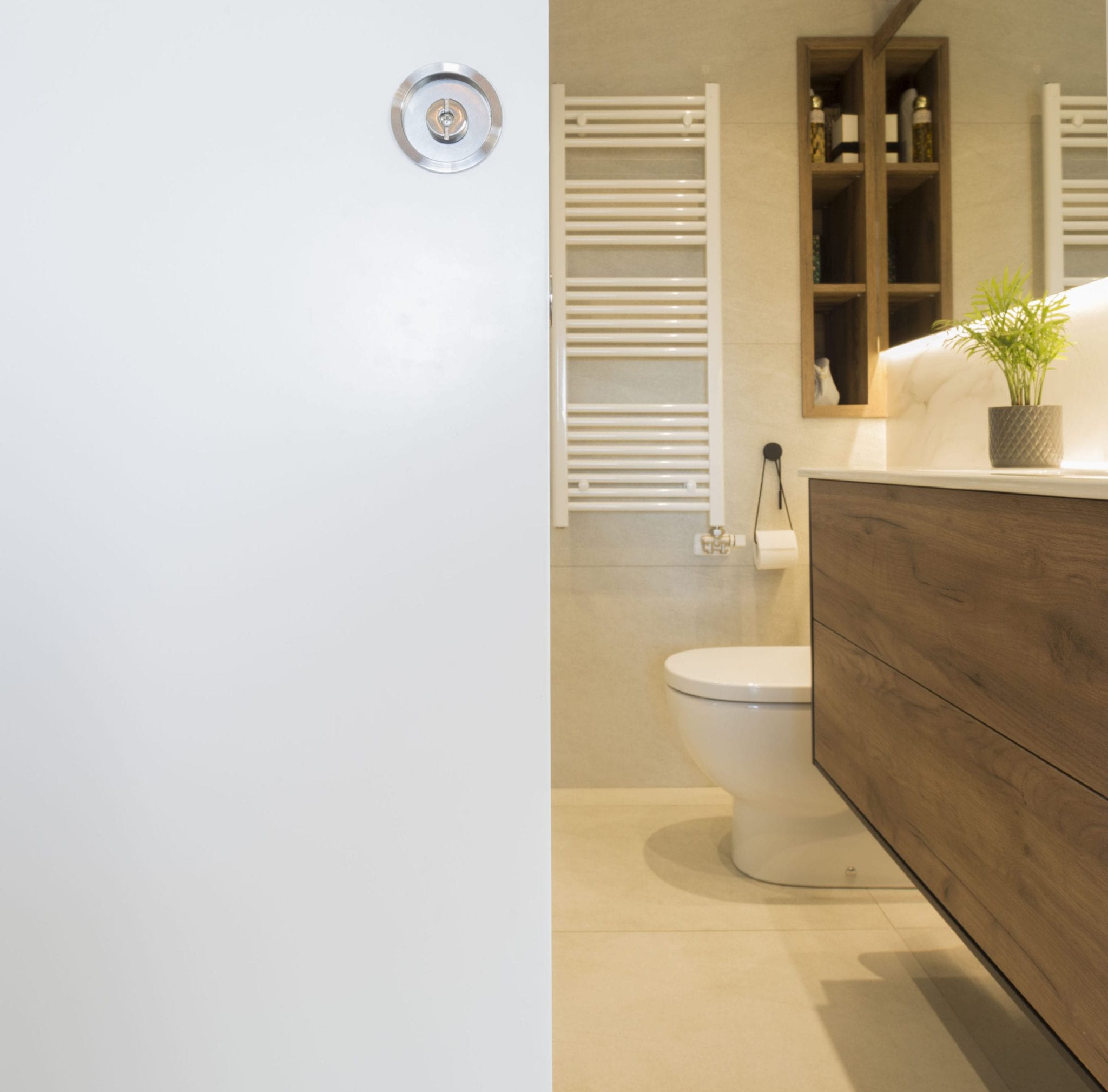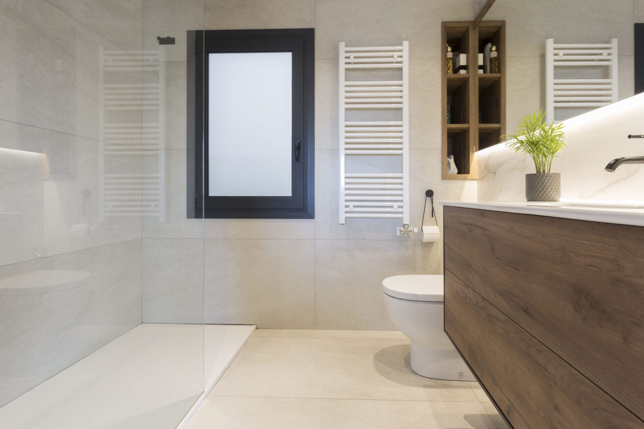 En els banys, s’ha apostat pel blanc com a protagonista, al costat de la fusta clara i materials nobles com el vidre, creant una gran mampara envidrada, perfecta per a crear la sensació d’amplitud necessària en espais reduïts. Contrasten, l’aixeteria negra i la fusteria dels tancaments, amb els colors suaus del bany i l’efecte amarmolat del revestiment de les parets, capaces de resistir la humitat produïda per la condensació de l’aigua calenta en el moment de la dutxa.