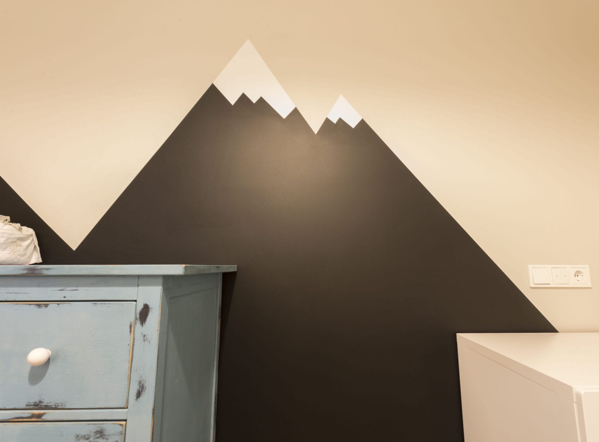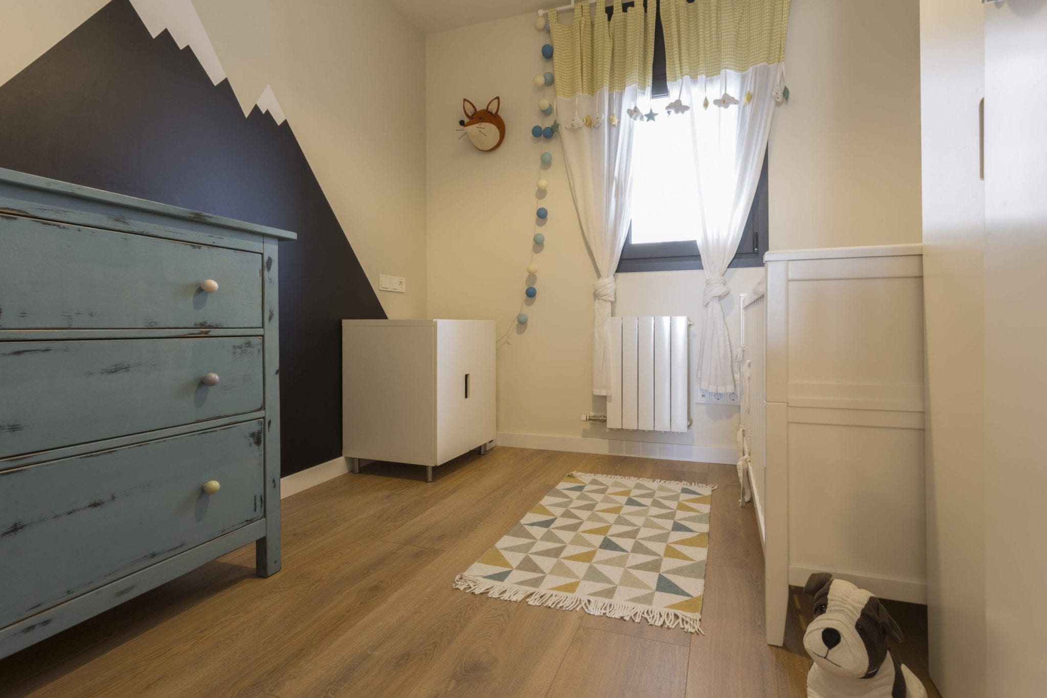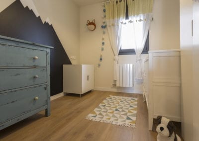 Sens dubte, l’habitació amb més personalitat, és l’habitació infantil, molt acollidora i amb mobiliari d’estil eco-restaurat i una pintura de paret personalitzada per a donar-li un aspecte més juvenil i desenfadat.