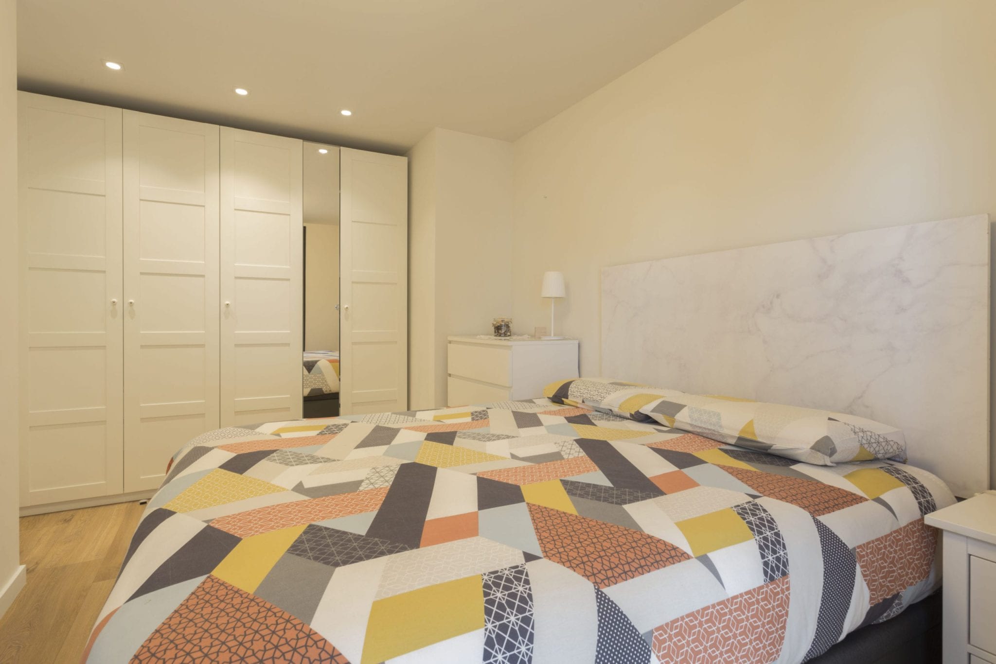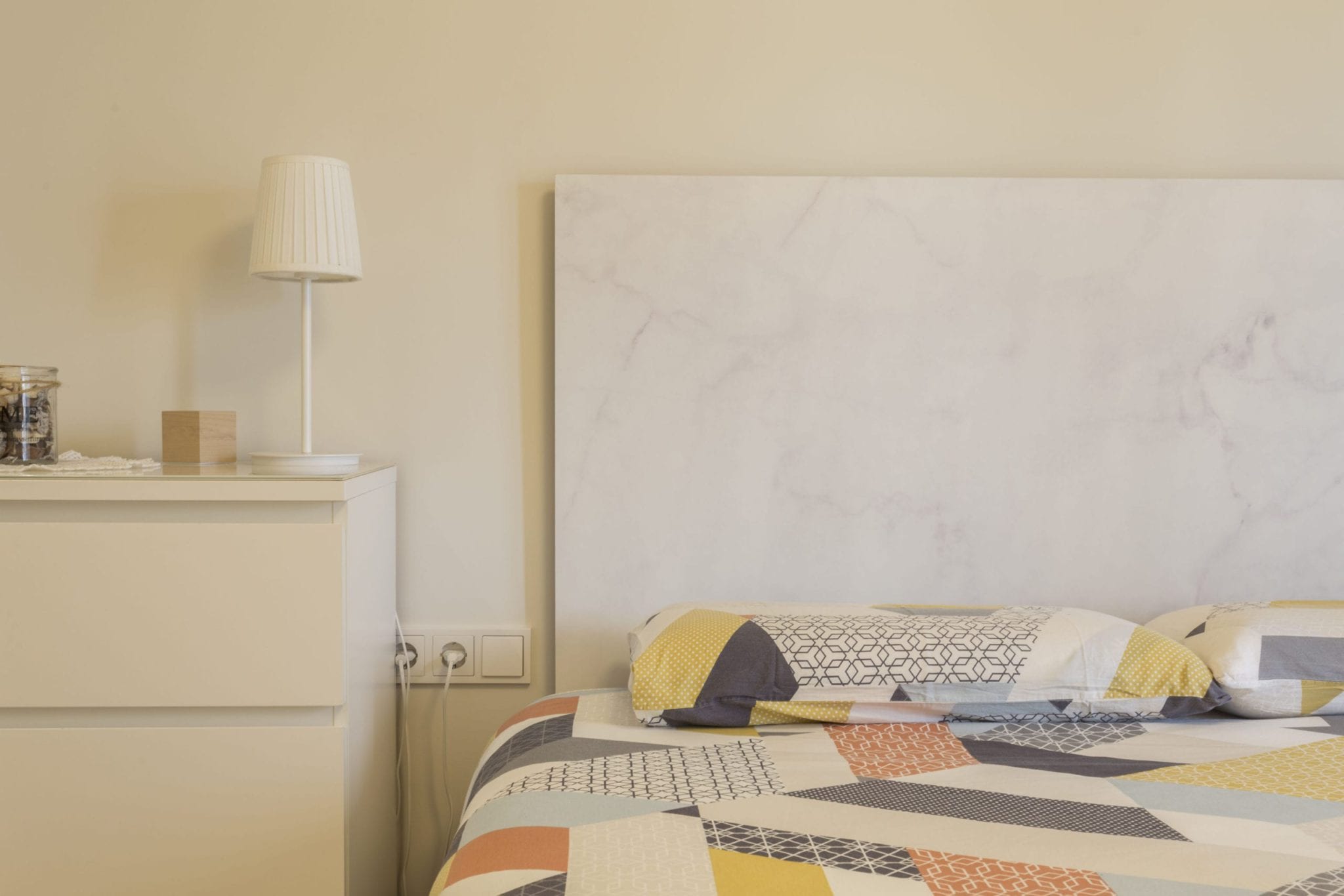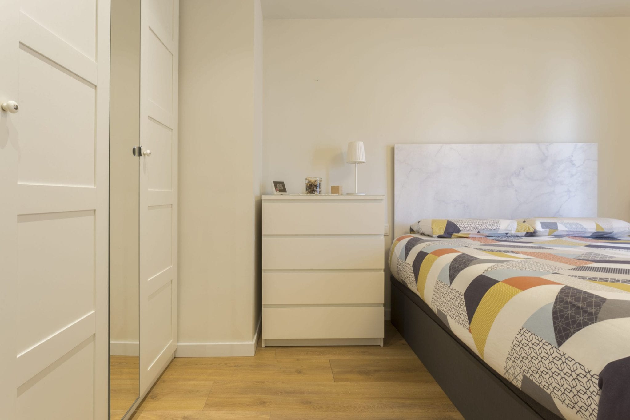 L’habitació doble, segueix la mateixa línia d’estil de tot l’habitatge, amb les tonalitats blanques, els armaris encastats a la paret i amb un estil molt personal en la decoració tèxtil del llit. Els colors i les formes geomètriques diuen molt de la personalitat alegre dels propietaris.
