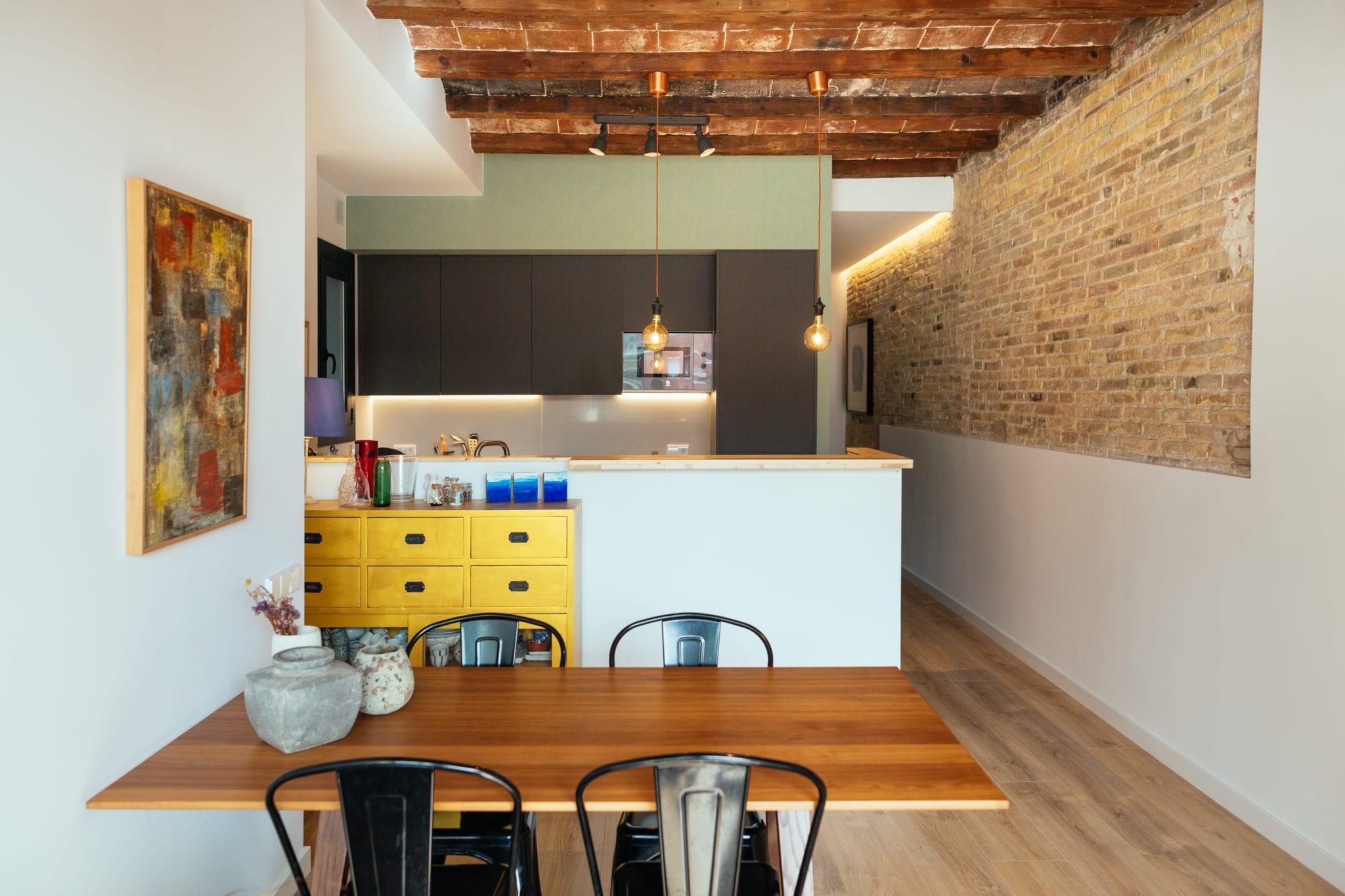 En el menjador, hem rescatat una fantàstica paret d’obra vesteixi que emmarca la zona de la cuina i combina a la perfecció amb els sostres.